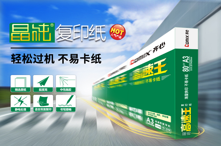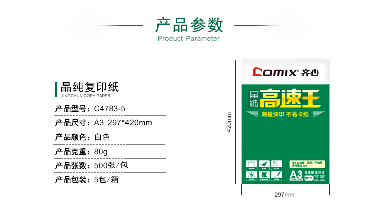 齐心C4783-5晶纯高速王复印纸 A3 80g 500张/包 5包/箱 单位:箱