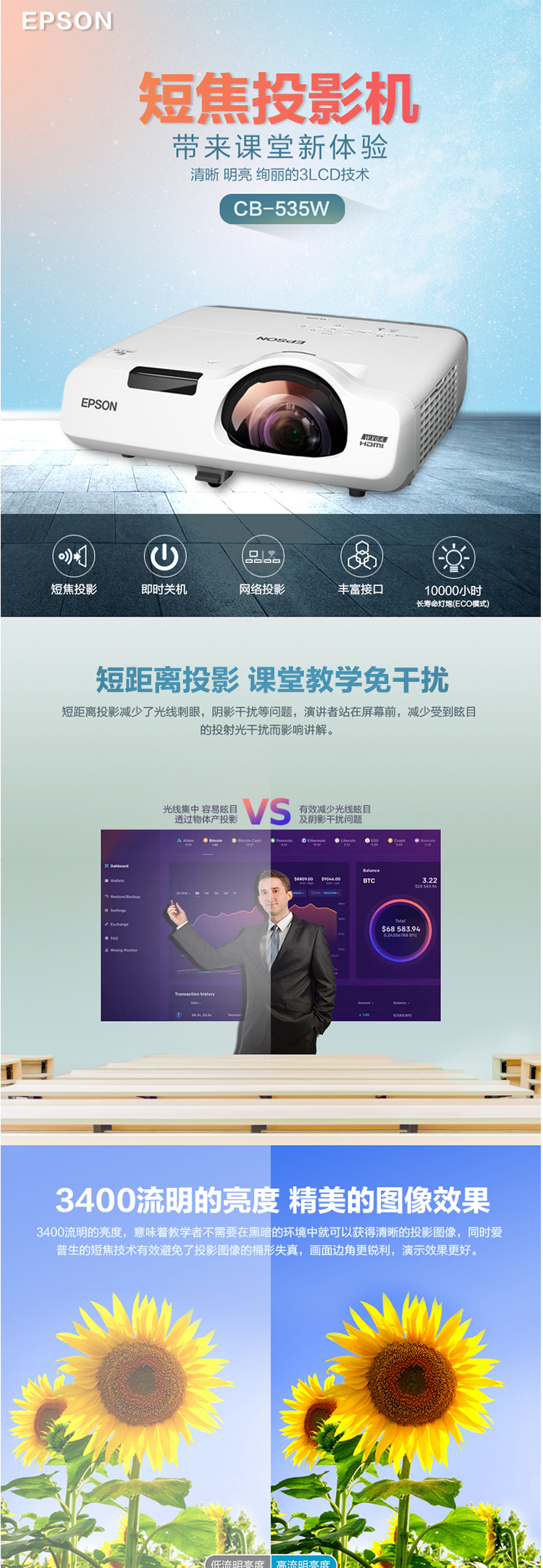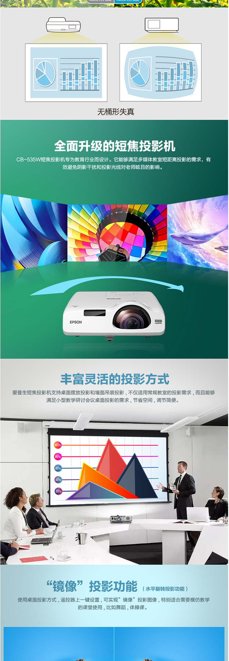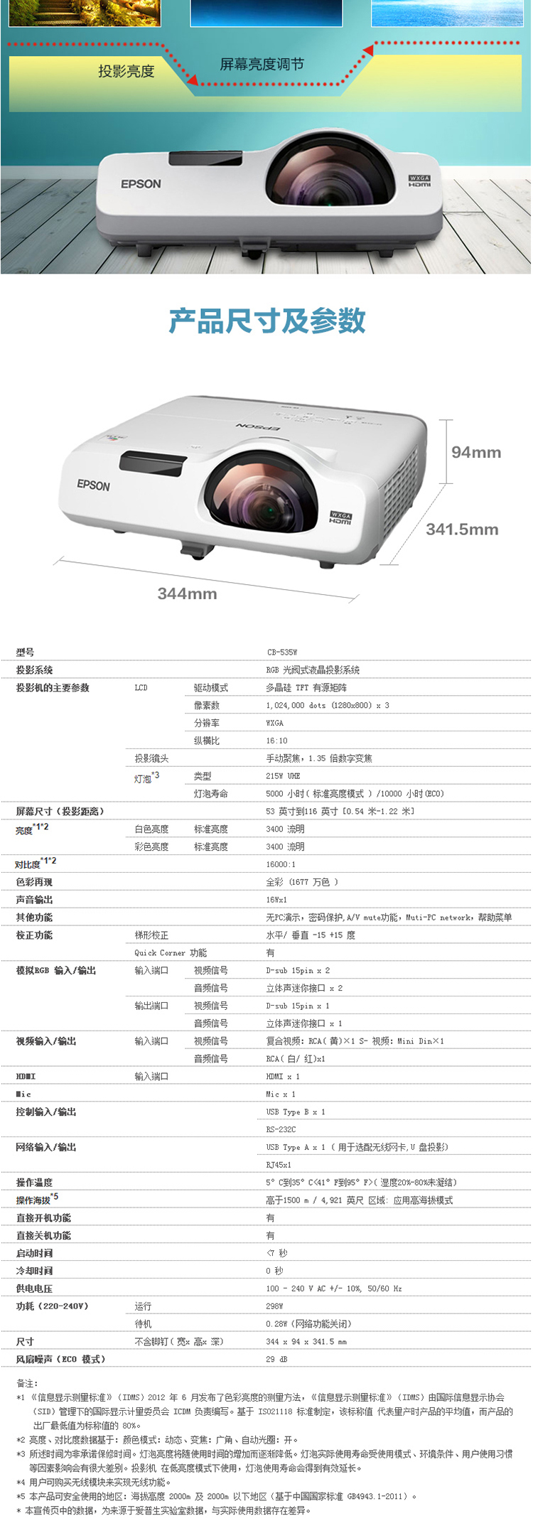 商品属性 [品牌] 爱普生 [参数] 产品类别 商务办公 安装方式 桌上正投;吊装正投 投影光源 灯泡 支持3D格式 不支持 显示技术 3LCD 建议尺寸范围 30-100 操作系统 无智能系统 3D播放 不支持3D功能 [型号] CB-535W [商品单位] 台