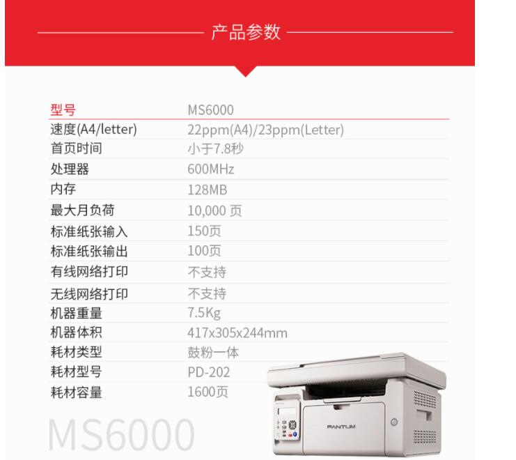 商品属性 [品牌] 奔图 [型号] MS6000 [参数] 功能 打印;复印;扫描 [商品单位] 台 [幅面] A4 [节能证书编号] CQC18701202134