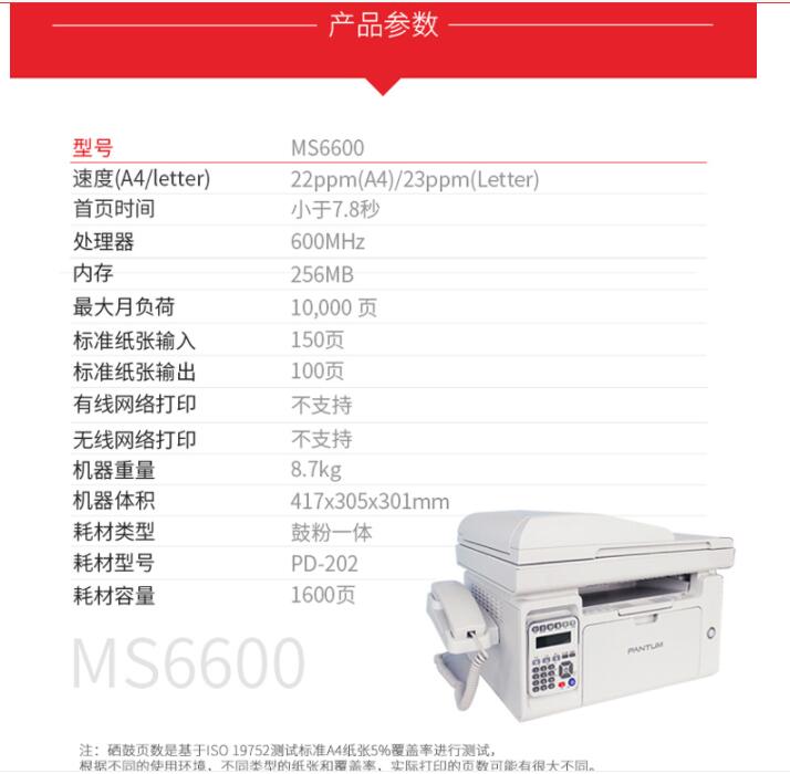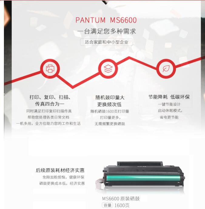 商品属性 [品牌] 奔图 [型号] MS6600 [参数] 功能 打印;复印;扫描 [商品单位] 台 [幅面] A4 [节能证书编号] CQC18701202134