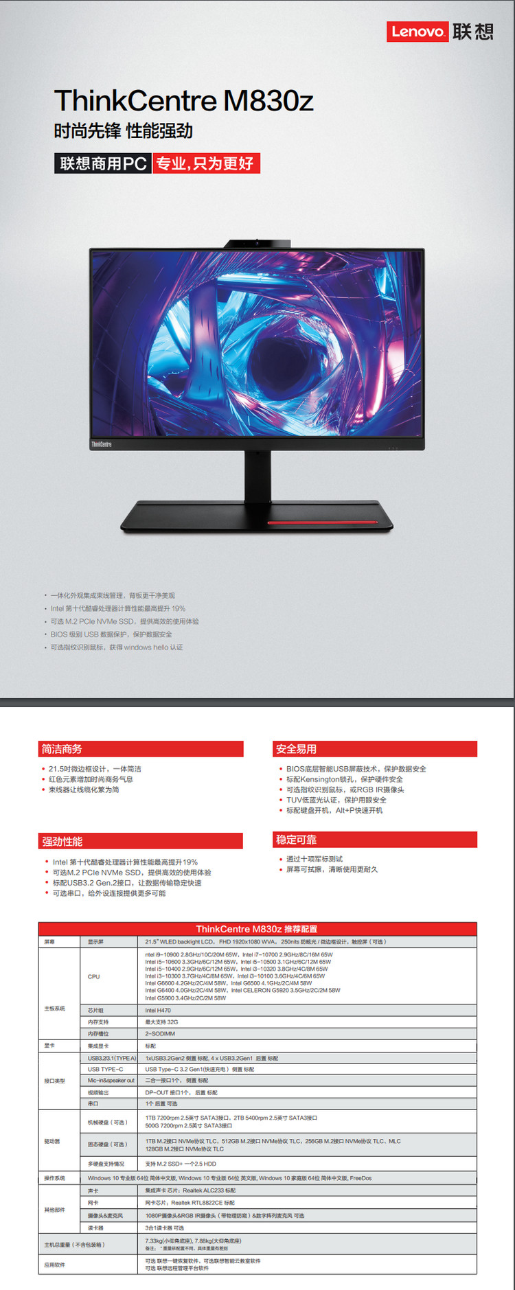 商品属性 [品牌] 联想 [型号] "Thinkcentre M830z-D095" [参数] I5-10500/4G/128G SSD+1T机械硬盘/集成/21.5寸全高清LED/USB键盘鼠标/三年保修上门服务/联想一键复原/win10 Home [屏幕尺寸] 21.5 [节能产品证书编号] CQC20701244654 [商品单位] 台