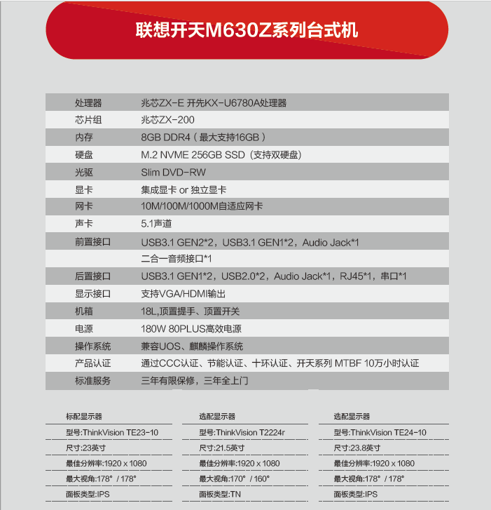 商品属性 [品牌] 联想 [型号] 开天 M630Z [参数] 兆芯 KX-U6780A 八核 2.7GHz /8GB DDR4 /256G M.2 NVME SSD 硬盘 /1G 独立显卡 /Slim DVDRW 刻录 /1000M 网卡 / 180W 80PLUS 认证电源 / 23 英寸 IPS 显示器 1920*1080/ 18L 机箱 /三年有限保修三年上门 /UOS V20或银河麒麟V10(试用版) [屏幕尺寸] 23 [节能产品证书编号] CQC19701225144 [商品单位] 台