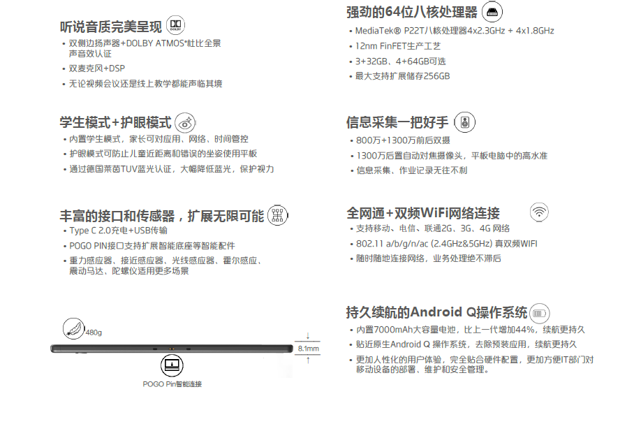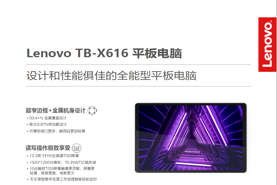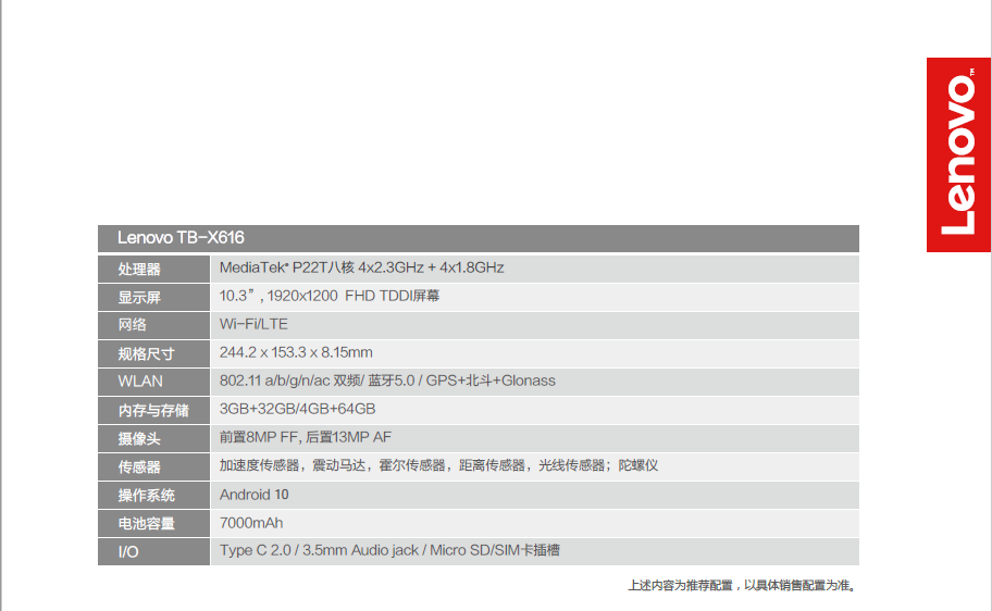 商品属性 [品牌] 联想 [型号] TB-X616F [商品单位] 台 [节能产品证书编号] CQC20701259016 [屏幕尺寸] 10.3英寸 [参数] MediaTek P22T Octa-core, 8核 (4x2.3GHz + 4x1.8GHz)/ 4GB内存/ 64GB(支持MicroSD卡扩展最大256GB)/WIFI / 10.3英寸???1920x1200 FHD TDDI 电容式触摸屏(10点触控)/8MP FF 前置摄像头+13MP AF 后置摄像头/2年保修