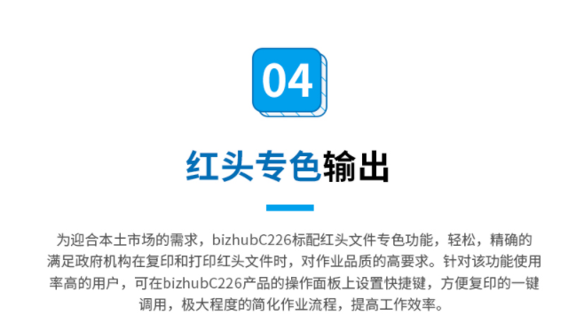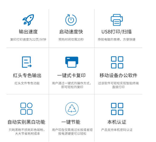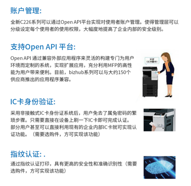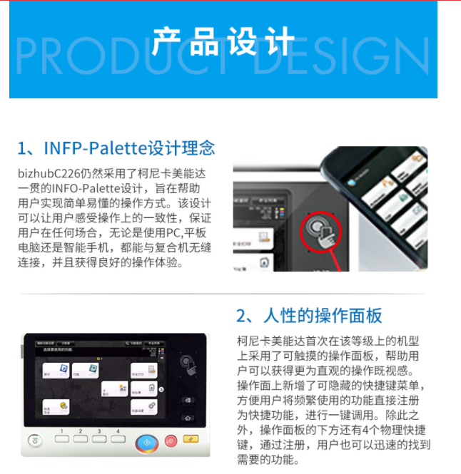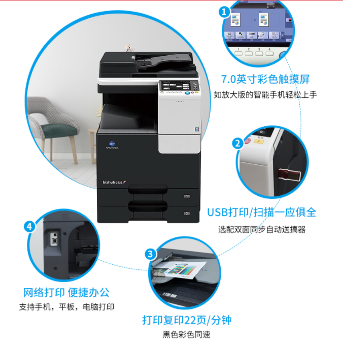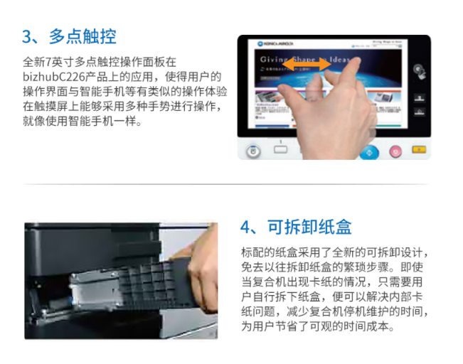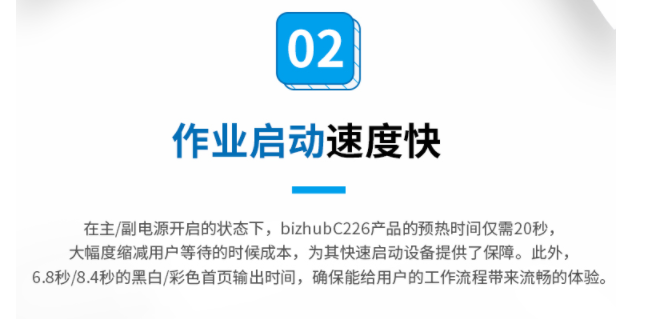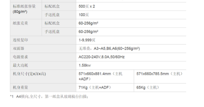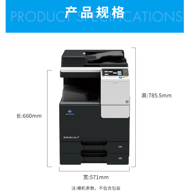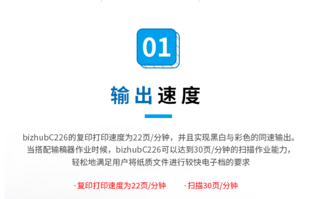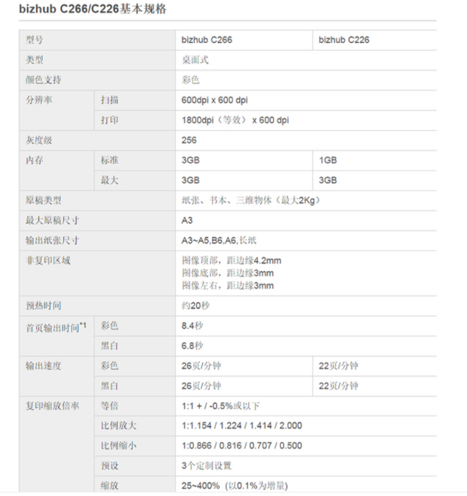 商品属性 [品牌] 柯尼卡美能达 [型号] bizhubC266 [参数] 扫描文件格式 TIFF, JPEG, PDF, Compact PDF,OOXML(pptx*1), XPS*1, Compact XPS*1 分辨率 推扫描 200dpi/300dpi/400dpi/600dpi 拉扫描 100dpi/200dpi/300dpi/400dpi/600dpi 最大原稿尺寸 A3 扫描速度 30页/分钟 [商品单位] 台 [打印速度划分 ] 中速机(25页~50页/分钟) [技术类型] 彩色激光 [纸张尺寸] A3~A5,B6,A6,长纸 [复印速度 ] 26页/分钟 [最大功耗 ] 1.58kw [首页复印时间 ] 彩色 8.4秒 黑白 6.8秒 [打印速度] 26页/分钟 [纸张容量 ] 标配纸盒 60-256g/m² 手送托盘 60-256g/m²