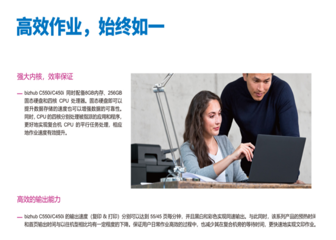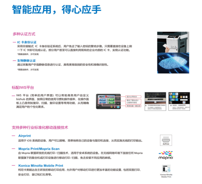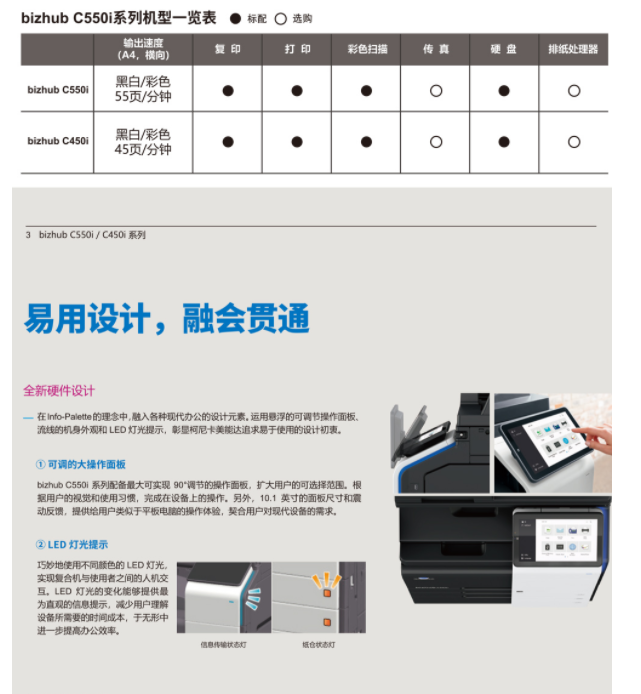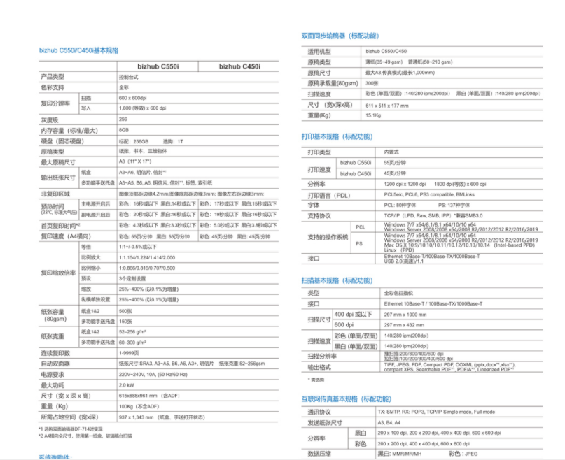 商品属性 [品牌] 柯尼卡美能达 [型号] bizhubC550i [参数] 操作系统 PCL:Windows7-10(详见商详) PS:Mac OSX(详见商详) 分辨率 1800dpi(等效)×600dpi 网络协议 TCP/IP 打印语言 详见商详 打印速度 55页/分钟 [打印速度划分 ] 高速机(50页分钟/以上) [纸张尺寸] A3/A4/A5/A6/B6 [复印速度 ] 55页/分钟 [最大功耗 ] 2.0kW [首页复印时间 ] 黑白3.3秒 彩色4.3秒 [商品单位] 台
