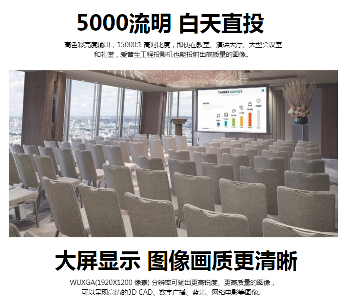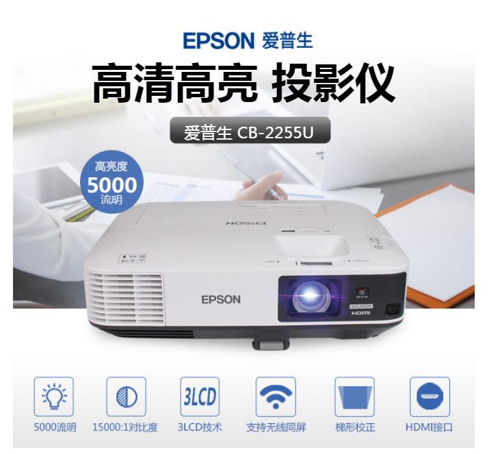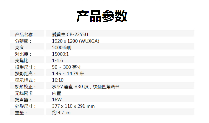 商品属性 [品牌] 爱普生 [型号] CB-2255U [标准显示分辨率(DPI)] 1920X1200dpi [尺寸(mm) ] 377x110x291 [VGA接口 ] 2 [标称对比度] 15000:1 [投影光源] 灯泡 [商品单位] 台 [亮度(流明)] 5000流明 [投影画面尺寸] 50-300英寸 [投影技术] LCD [投影方式] 正投 [屏幕宽高比例] 16:10 [质保时间] 两年保修