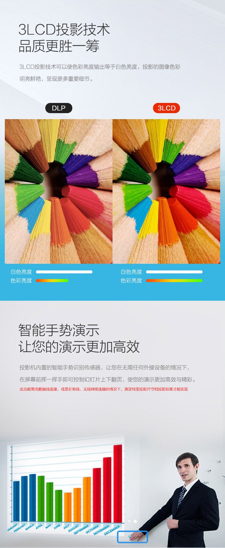 [参数] 产品类别 商务办公 安装方式 桌上正投;吊装正投;吊装背投 认证型号 CB-2265U 投影光源 灯泡 支持3D格式 不支持 显示技术 3LCD 建议尺寸范围 30-150 操作系统 无智能系统 3D播放 不支持3D功能