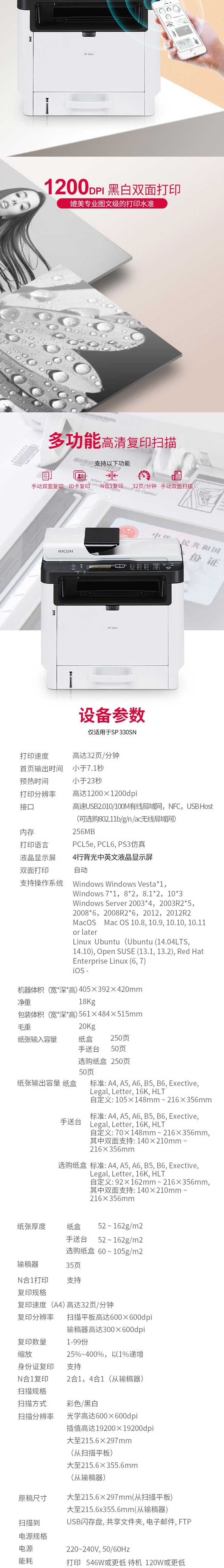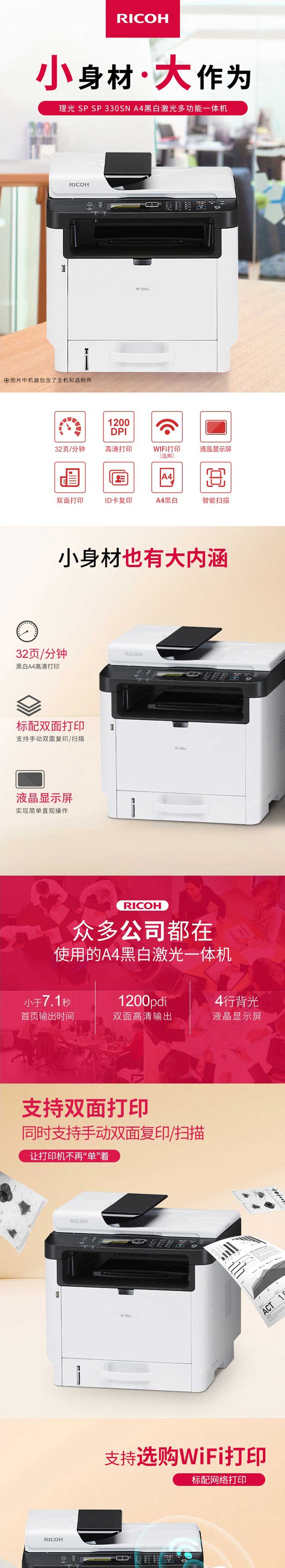 理光 SP 330SN A4激光三合一多功能一体机(打印、复印、扫描、自动双面、网络)