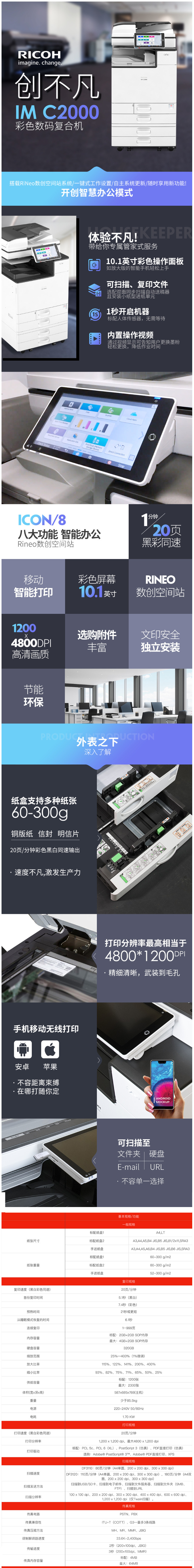 理光(Ricoh)IM C2000 A3彩色多功能数码复合机+DF3110(主机+双面器+双面送稿器+网络打印+网络扫描+工作台底柜)