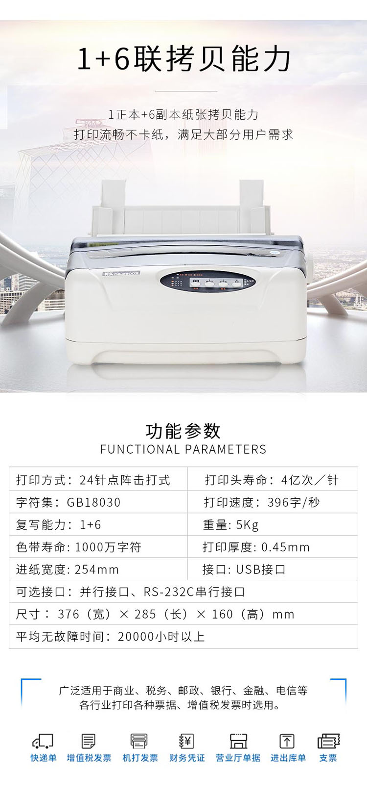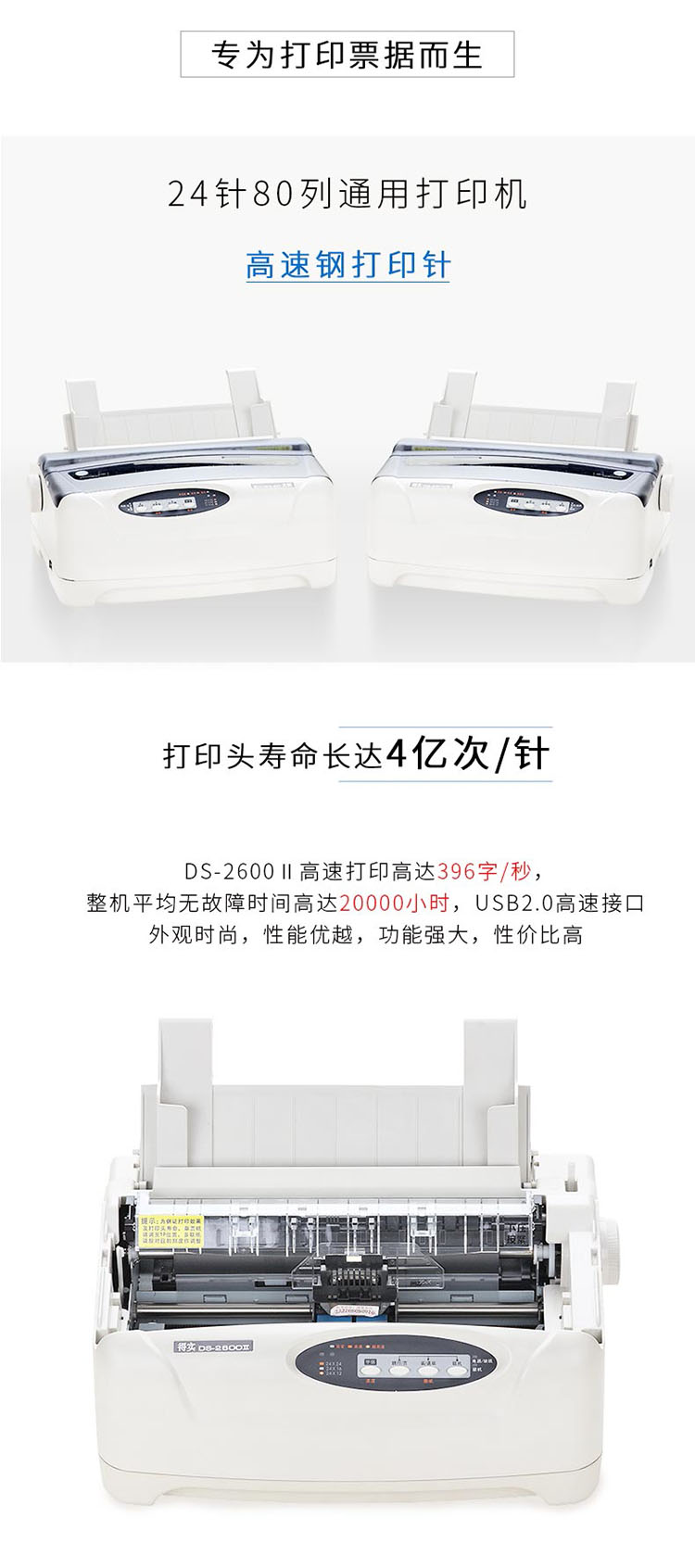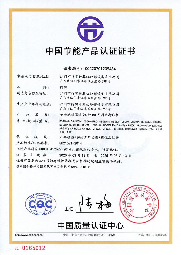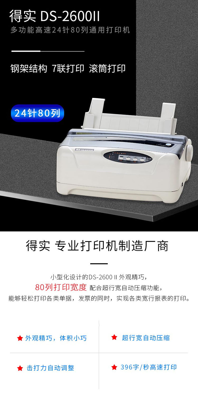 商品属性 [品牌] 得实 [型号] DS-2600II [商品单位] 台 [节能产品证书编号] CQC20701239484 [幅面] A4 [打印机类型] 针式打印 [针数] 24针 [打印针寿命(次/针)] 4亿次/针 [接口] 并行接口,USB2.0接口 [质保时间] 1年 [打印速度] 375字/秒