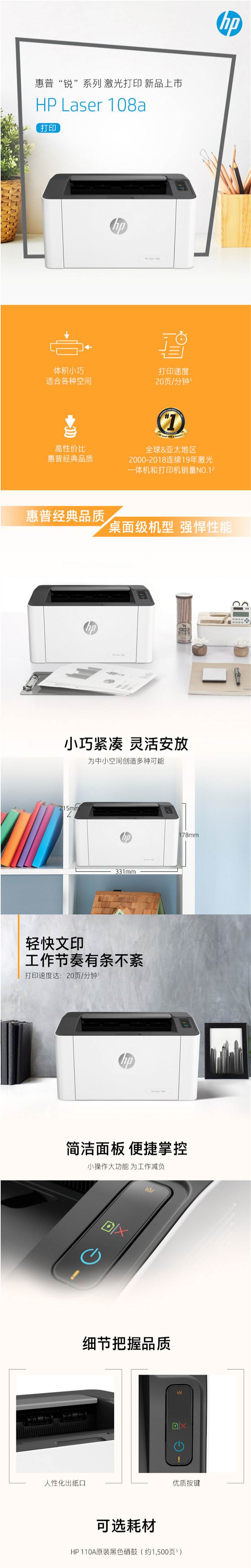 商品属性 [品牌] 惠普 [型号] Laser 108a [节能证书编号] CQC19701211692 [商品单位] 台 [首次打印时间] 8.3秒(就绪后),18秒(睡眠) [打印分辨率] 1200×1200dpi [黑白打印速度] A4:20ppm,Letter:21ppm [最大打印幅面] A4 [自动双面打印] 手动 [质保时间] 1年 [耗材类型] 鼓粉一体 [数据接口] USB2.0