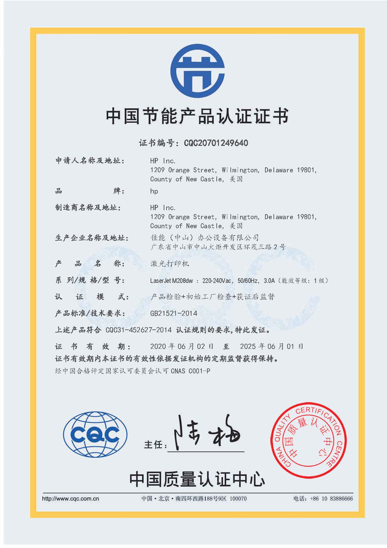[节能证书编号] CQC20701249640