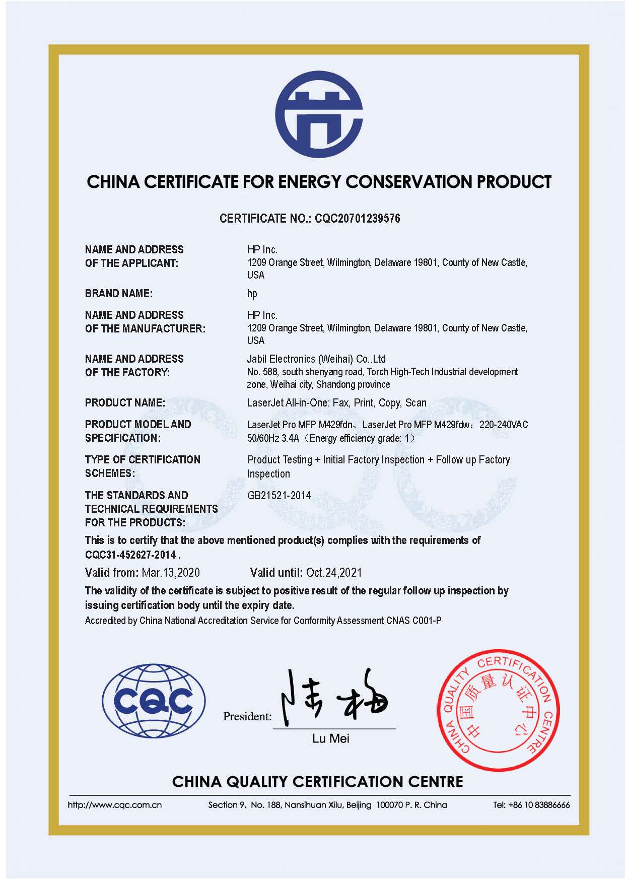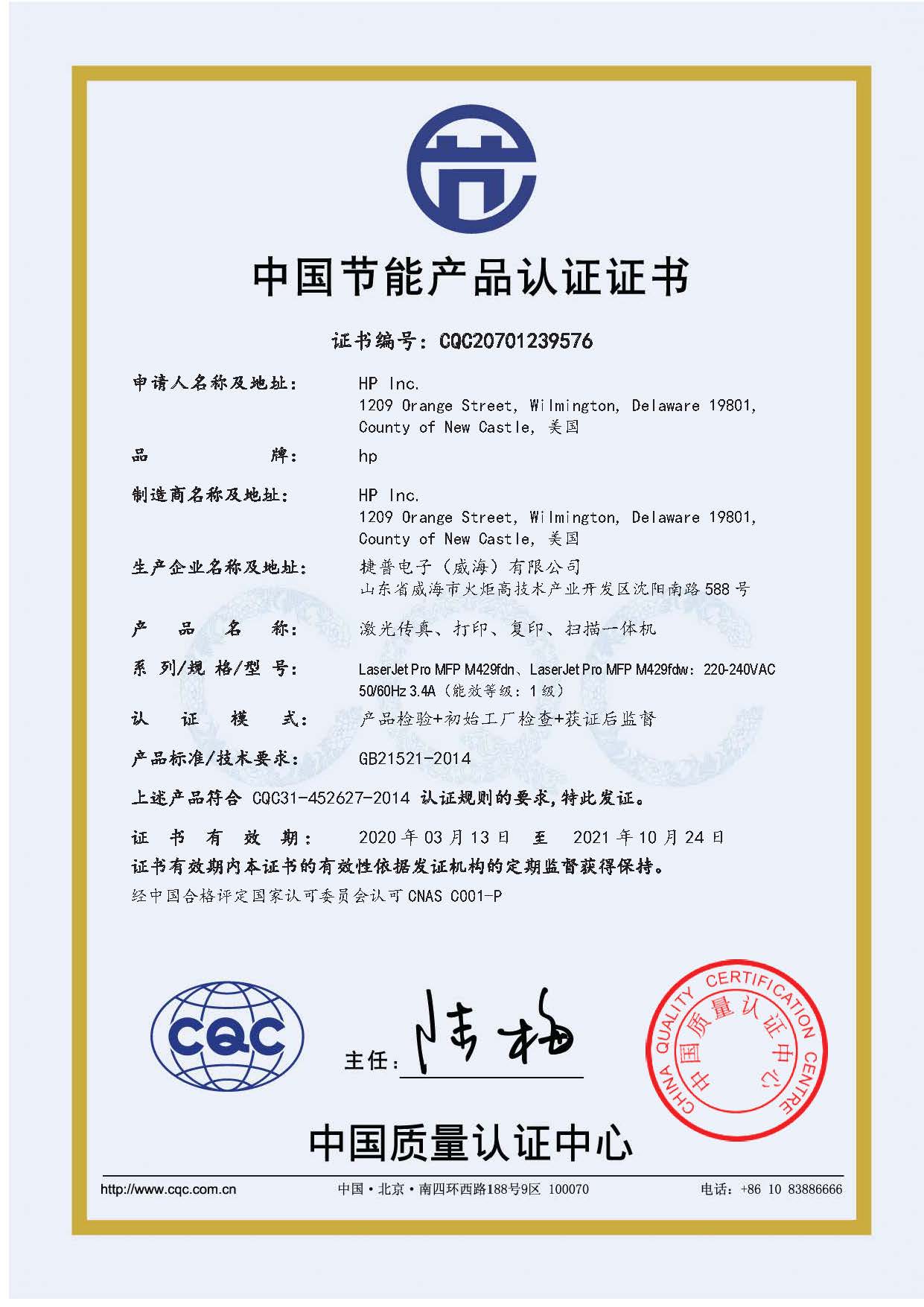[节能证书编号] CQC20701239576
