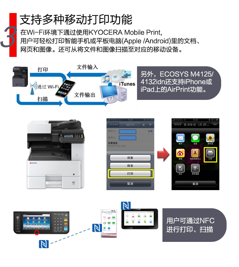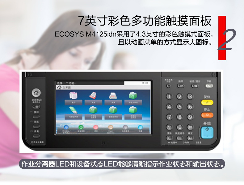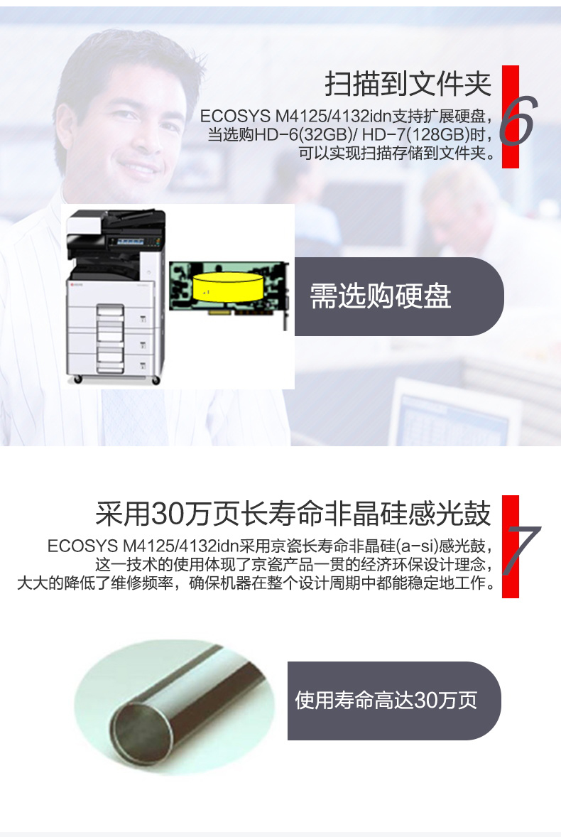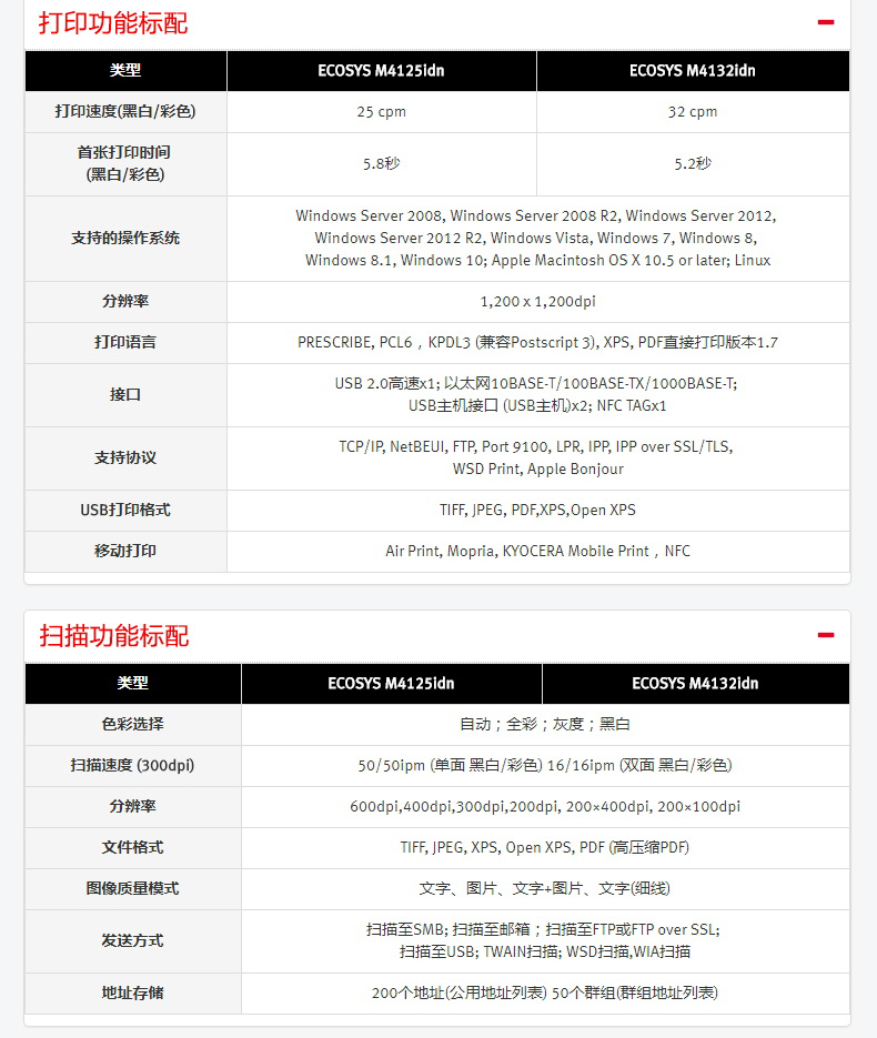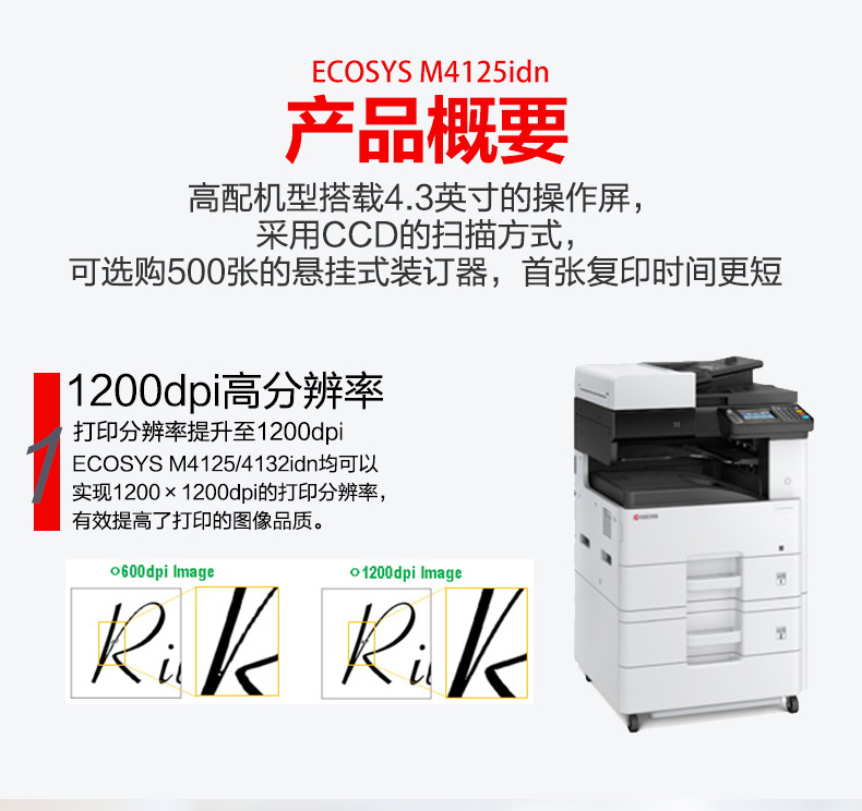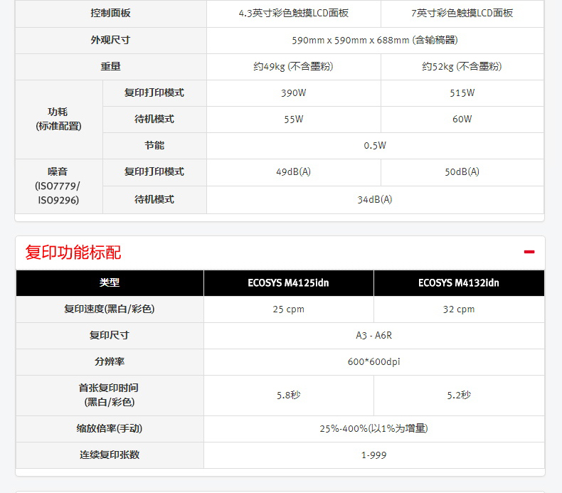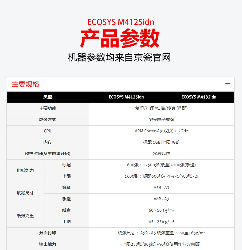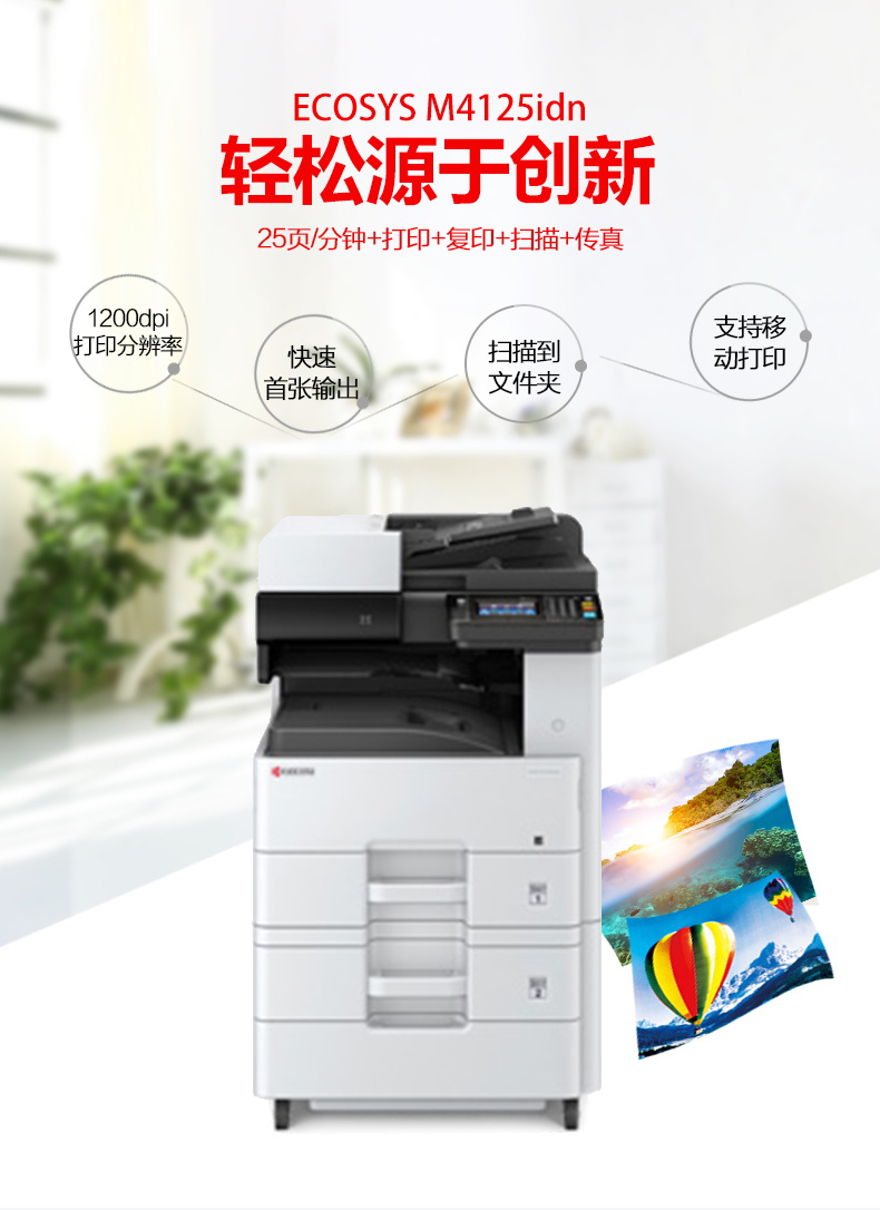 商品属性 [品牌] 京瓷 [型号] M4125idn [商品单位] 台 [标配纸盒容量] 600张 [复印分辨率] 600*600dpi [双面输稿器] 有 [装订器] 无 [最大复印尺寸] A3 - A6R [首页输出时间] 5.8秒 [预热时间] 20秒以内 [质保时间] 3年 [内存容量] 标配 1GB [售后服务内容] 3年质保