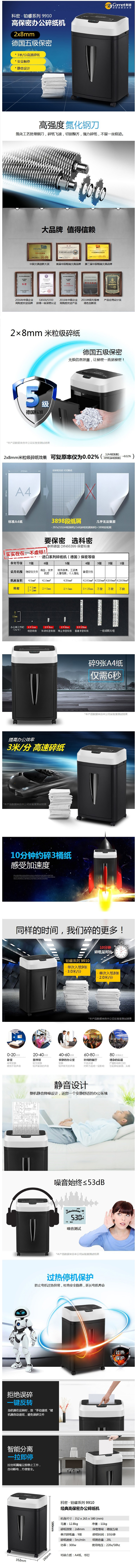 商品属性 [品牌] 科密 [型号] 9910 [商品单位] 台 [碎纸速度] 2.1-3.0米/分钟 [噪音分贝] 50-60dB [连续粉碎时间(min)] 0-10分钟 [类型] 办公商用碎纸机 [碎纸能力(张/次)] 9张 [碎纸箱容积(L)] 20L [粉碎材质] 纸 [粉碎方式] 米粒状 [售后服务内容] 1年质保 [碎纸效果] 2×8MM [质保时间] 1年