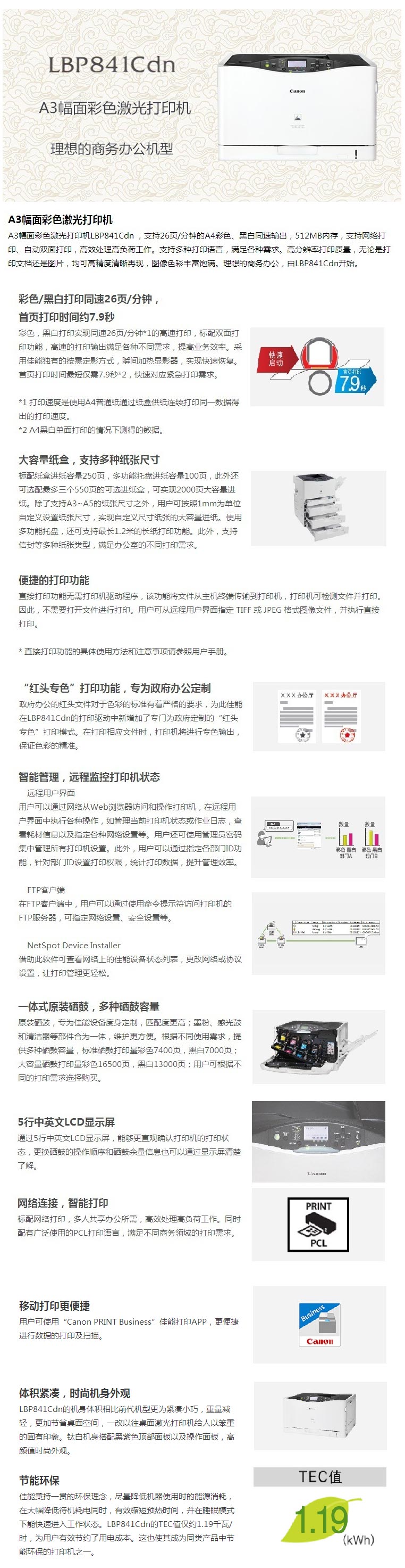商品属性 [品牌] 佳能 [型号] LBP841Cdn [节能证书编号] CQC17701164285 [参数] 台 [打印分辨率] 1200×1200dpi [黑白打印速度] A3:15ppm,A4:26ppm [最大打印幅面] A3 [自动双面打印] 支持 [无线网络打印] 不支持 [耗材类型] 鼓粉一体 [售后服务内容] 1年质保 [数据接口] 高速USB接口(2个,背面) 10Base-T/100Base-TX/1000Base-T(RJ-45网络接口) [彩色打印速度] A3:15ppm,A4:26ppm