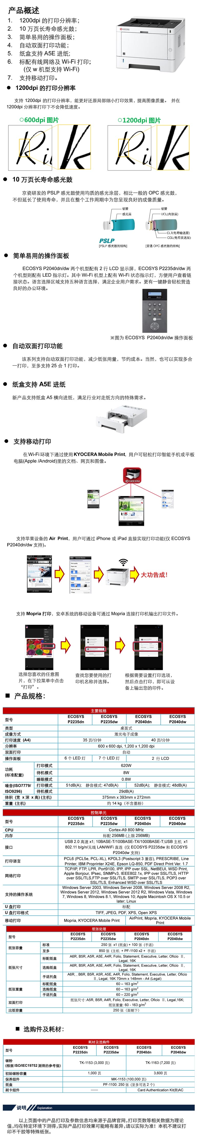 商品属性 [品牌] 京瓷 [型号] ECOSYS P2235dn [节能证书编号] CQC19701233590 [商品单位] 台 [打印分辨率] 1200×1200dpi [黑白打印速度] 35ppm [最大打印幅面] A4 [自动双面打印] 支持 [质保时间] 1年 [耗材类型] 鼓粉分离 [售后服务内容] 1年质保 [数据接口] USB2.0 10Base-T/100Base-TX/1000Base-T(RJ-45网络接口) USB主机1个 [随机附件] 标配