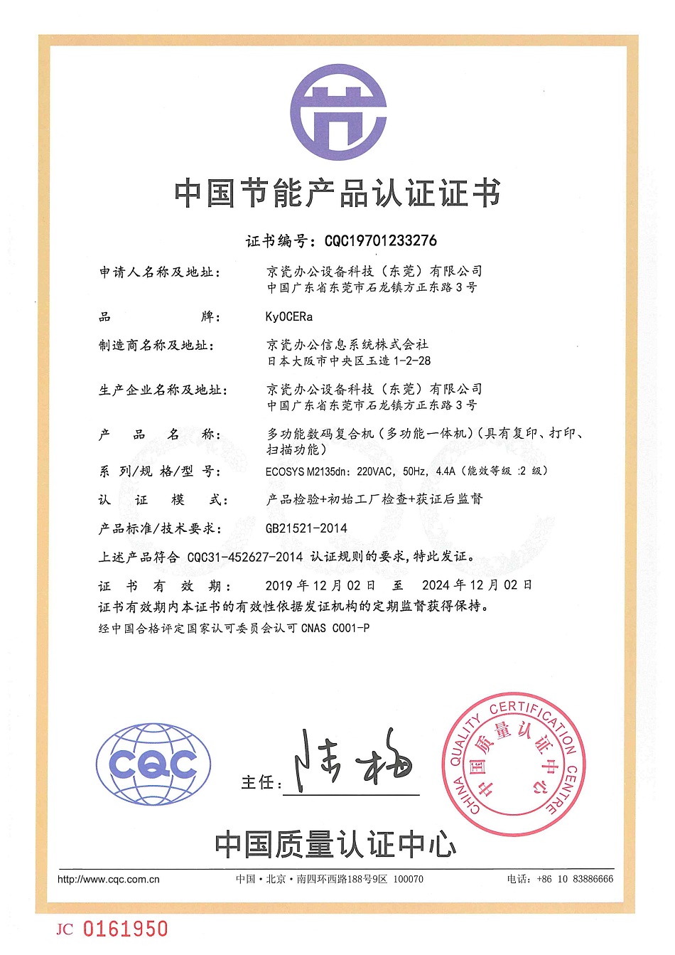 [节能证书编号] CQC19701233276