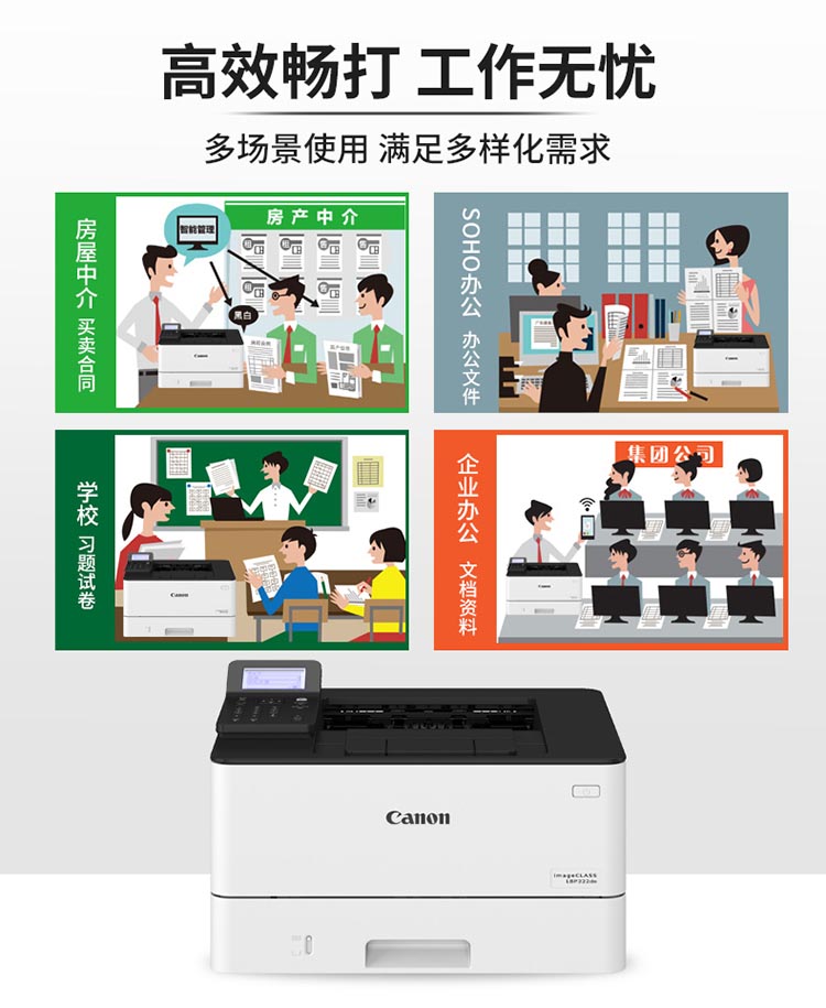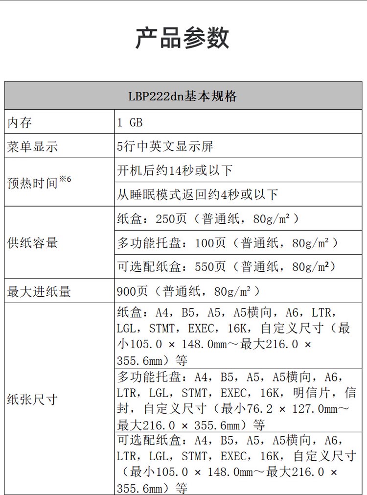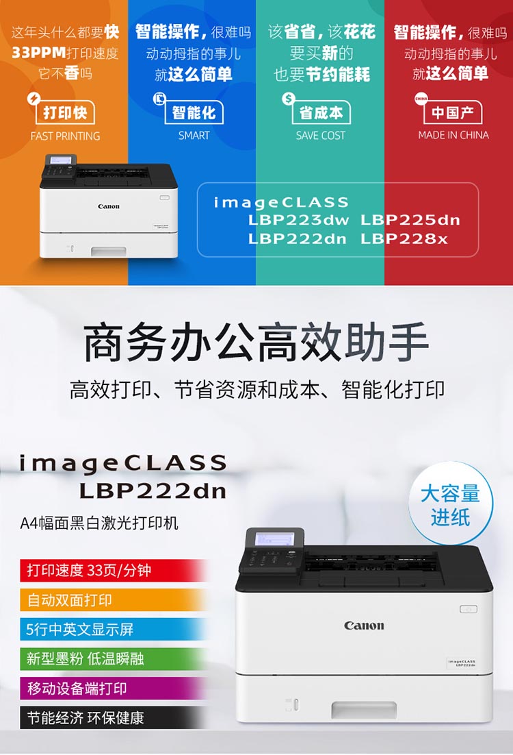 商品属性 [品牌] 佳能 [型号] LBP222DN [商品单位] 台 [打印分辨率] 1200×1200dpi [黑白打印速度] 33ppm [最大打印幅面] A4 [自动双面打印] 支持 [无线网络打印] 支持 [质保时间] 1年 [耗材类型] 鼓粉一体 [售后服务内容] 1年质保 [数据接口] USB2.0 10Base-T/100Base-TX/1000Base-T