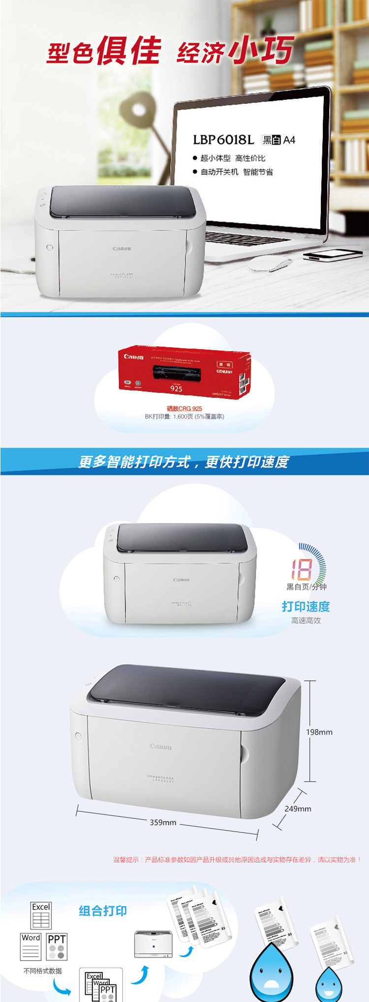佳能 黑白激光打印机 LBP6018L 白色 A4幅面