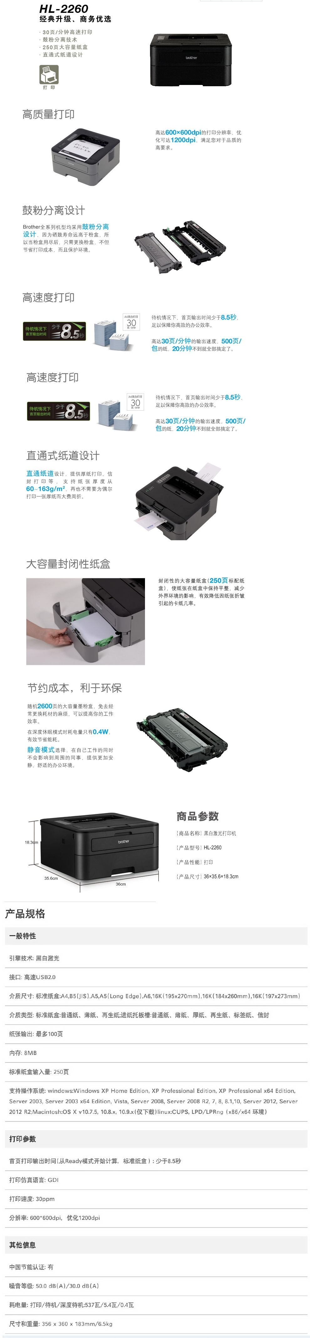 兄弟 HL-2260 黑白激光打印机 双面打印