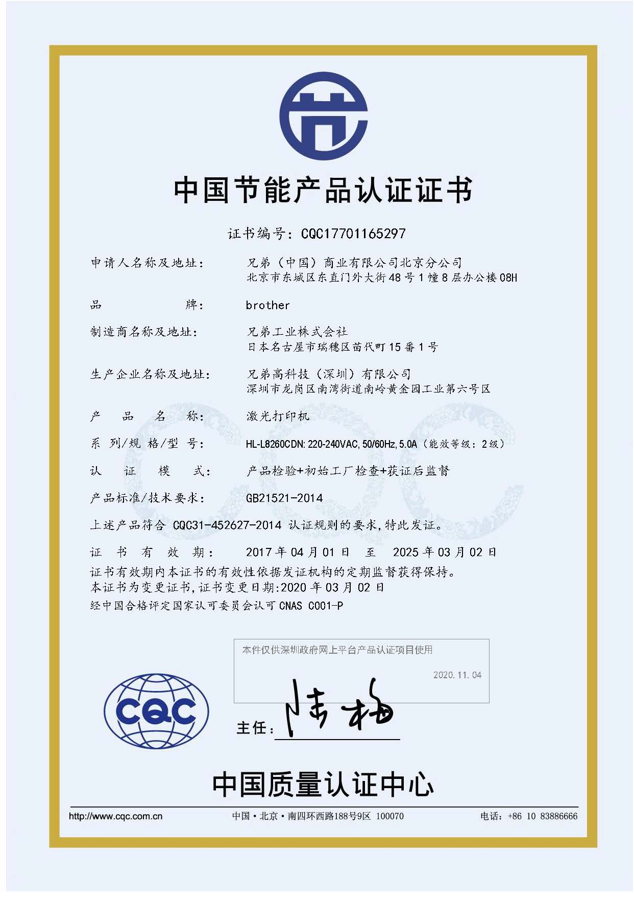 [节能证书编号] CQC17701165297
