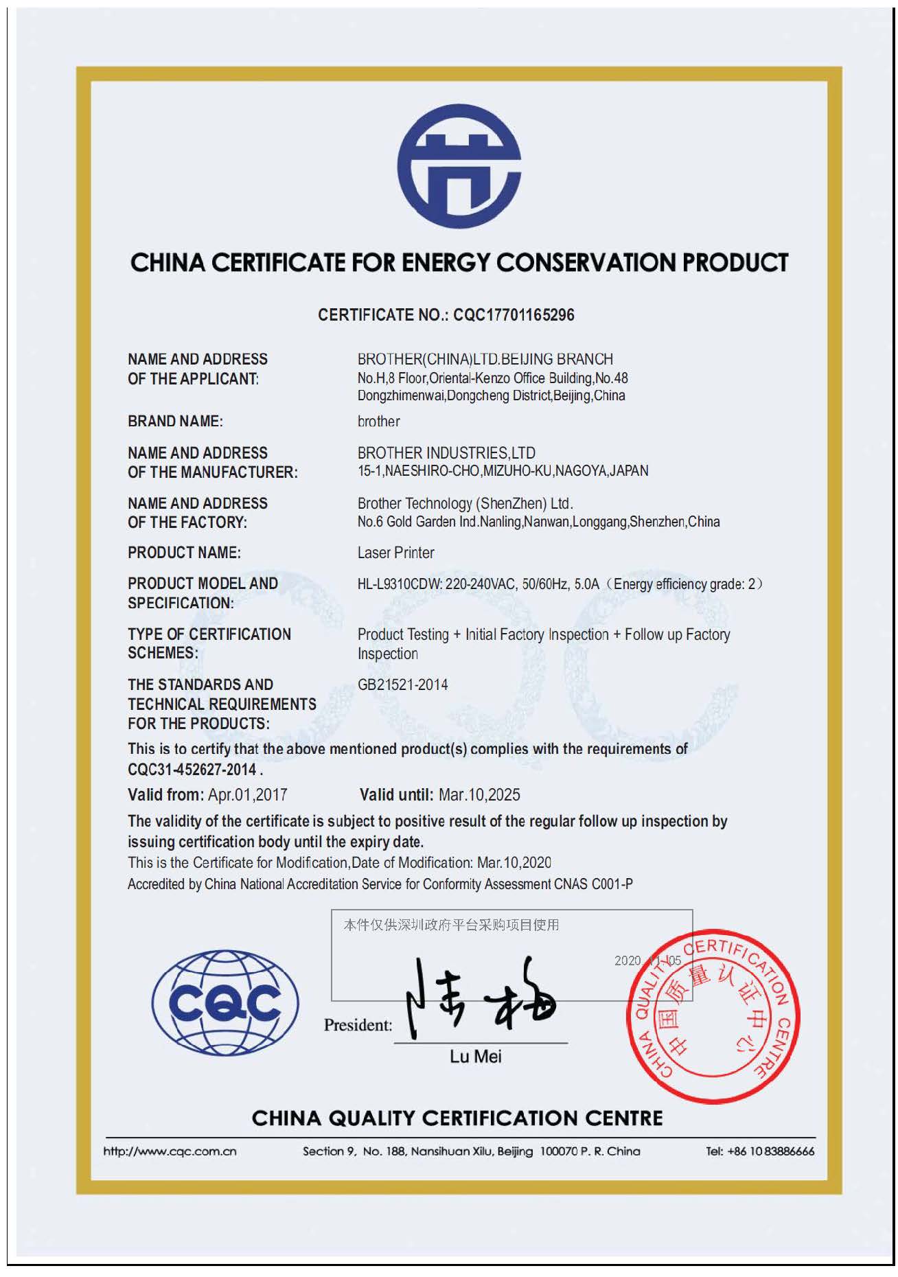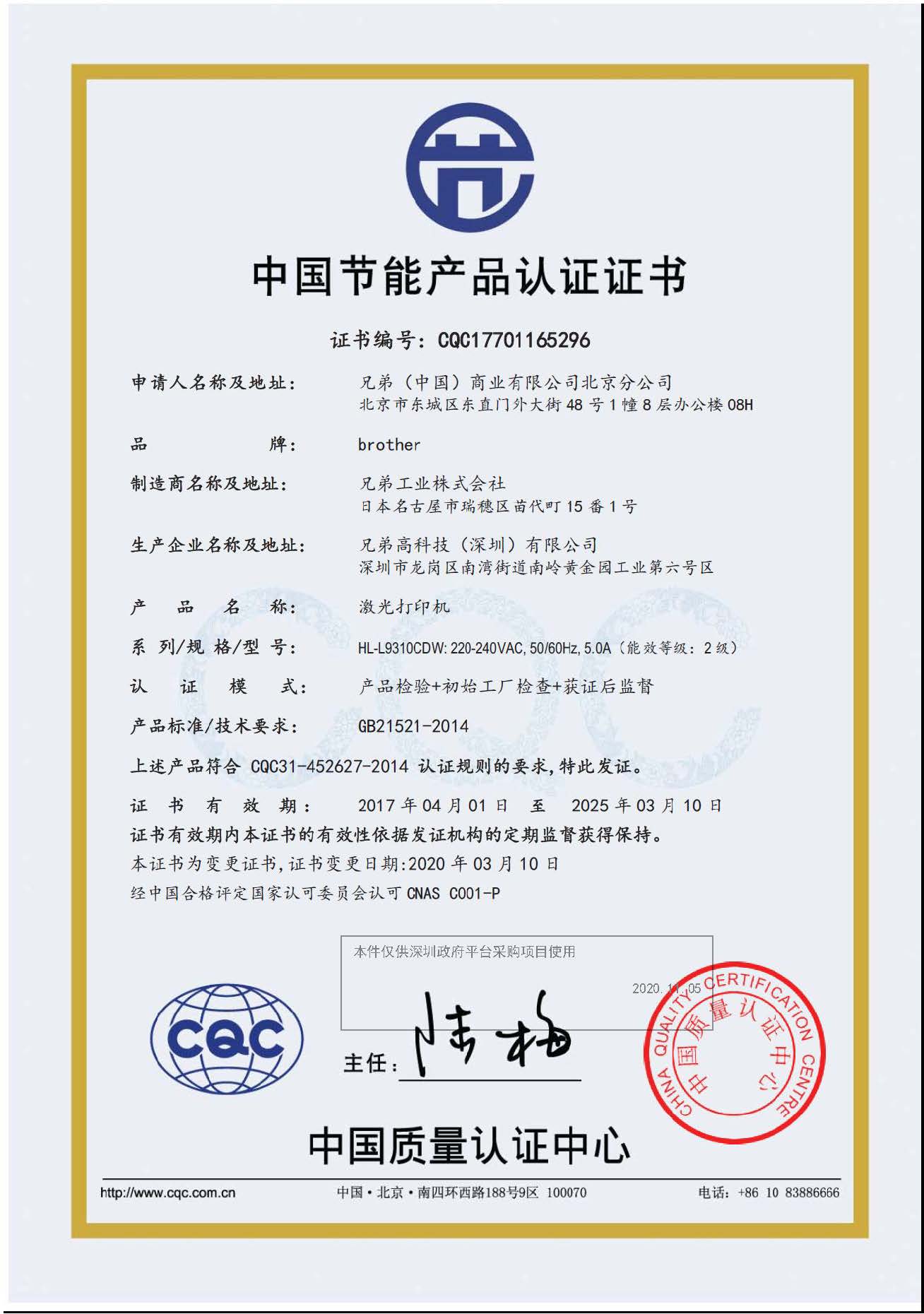 [节能证书编号] CQC17701165296