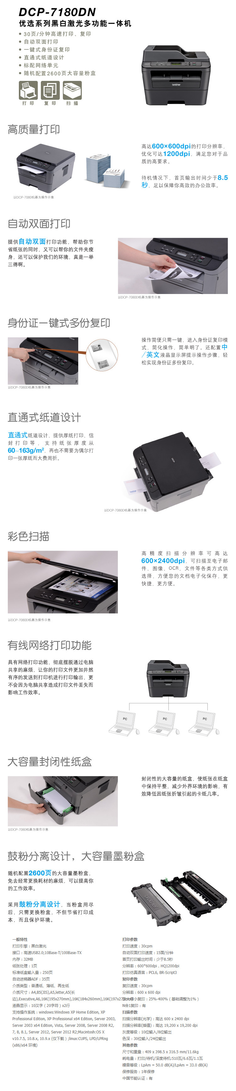 商品属性 [品牌] 兄弟 [型号] DCP-7180DN [商品单位] 台 [节能证书编号] CQC16701156288 [打印分辨率] 600×600DPI [涵盖功能] 打印/复印/扫描 [最大处理幅面] A4 [黑白打印速度] 30PPM [双面打印] 支持 [网络打印] 支持 [质保时间] 1年 [数据接口] 高速USB2.0;10Base-T/100Base-TX [随机附件] 标配 [售后服务内容] 一年保修