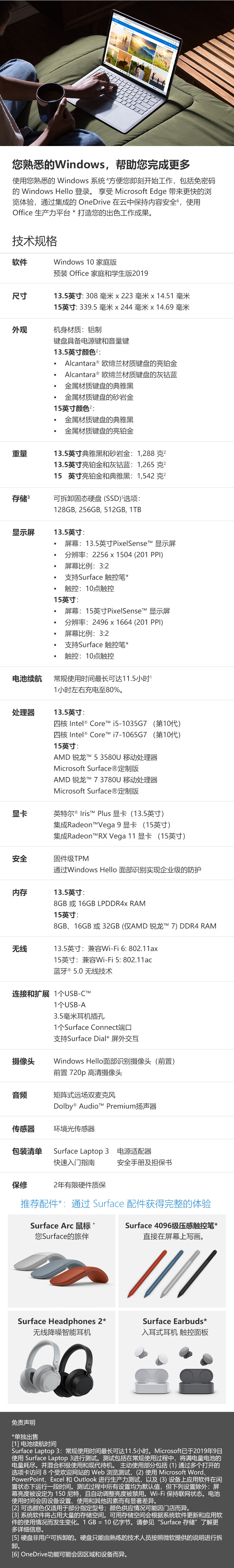 微软 Surface Laptop3 13.5英寸笔记本电脑(i5-1035G7/8G/256G/win10/中文版/两年保修) 单位:台