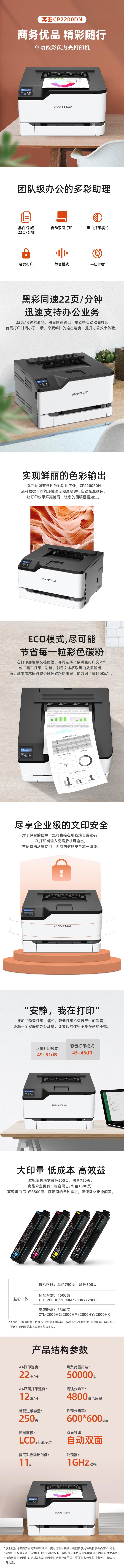 商品属性 [品牌] 奔图CP2200DN [型号] CP2200DN [产品尺寸(mm)] 411.2*394.1*243.7 [打印机语言] PCLm/PS3/PCL6/PCL5 [支持纸张尺寸] 纸张尺寸: A4/A5/A5LEF/A6/JIS B5/Oficio/Hagaki明信片/Statement/Executive/Letter/Folio/Legal/通用纸张 信封尺寸: DL信封/C5信封/B5信封/7*3/4信封/#9信封/#10信封 [首次打印时间] 从就绪:11s/11s 从睡眠:16.5s/16.5s [打印分辨率] 600×600DPI [节能证书编号] CQC20701236179 [商品单位] 台 [自动双面打印] 支持 [质保时间] 1年 [耗材类型] 一体式硒鼓 [售后服务内容] 1年质保 [数据接口] Hi-Speed USB 2.0(Type B) 10/100/1000 BaseTX Ethernet(RJ-45) [彩色打印速度] 22PPM
