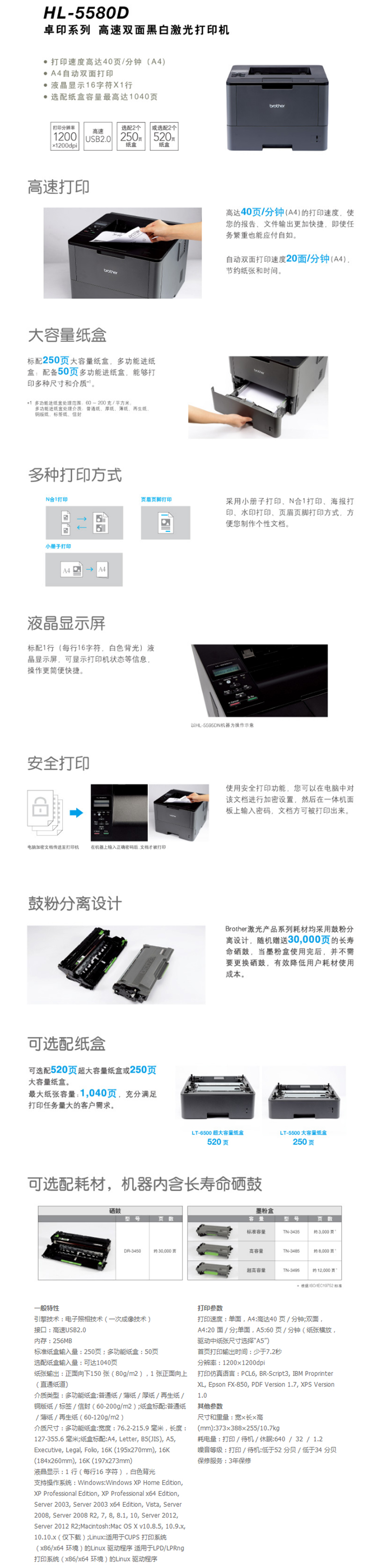 商品属性 [品牌] 兄弟 [型号] HL-5580D [打印分辨率] 1200×1200dpi [节能证书编号] CQC18701194705 [商品单位] 台 [黑白打印速度] 单面: A4:40ppm,A5:60 ppm(纸张横放,驱动中纸张尺寸选择“A5)不支持 [最大打印幅面] A4 [自动双面打印] 支持 [无线网络打印] 不支持 [质保时间] 1年 [耗材类型] 鼓粉分离式硒鼓 [售后服务内容] 1年质保 [数据接口] USB2.0