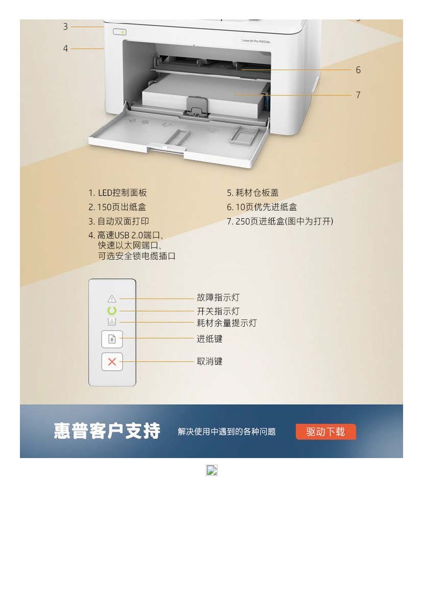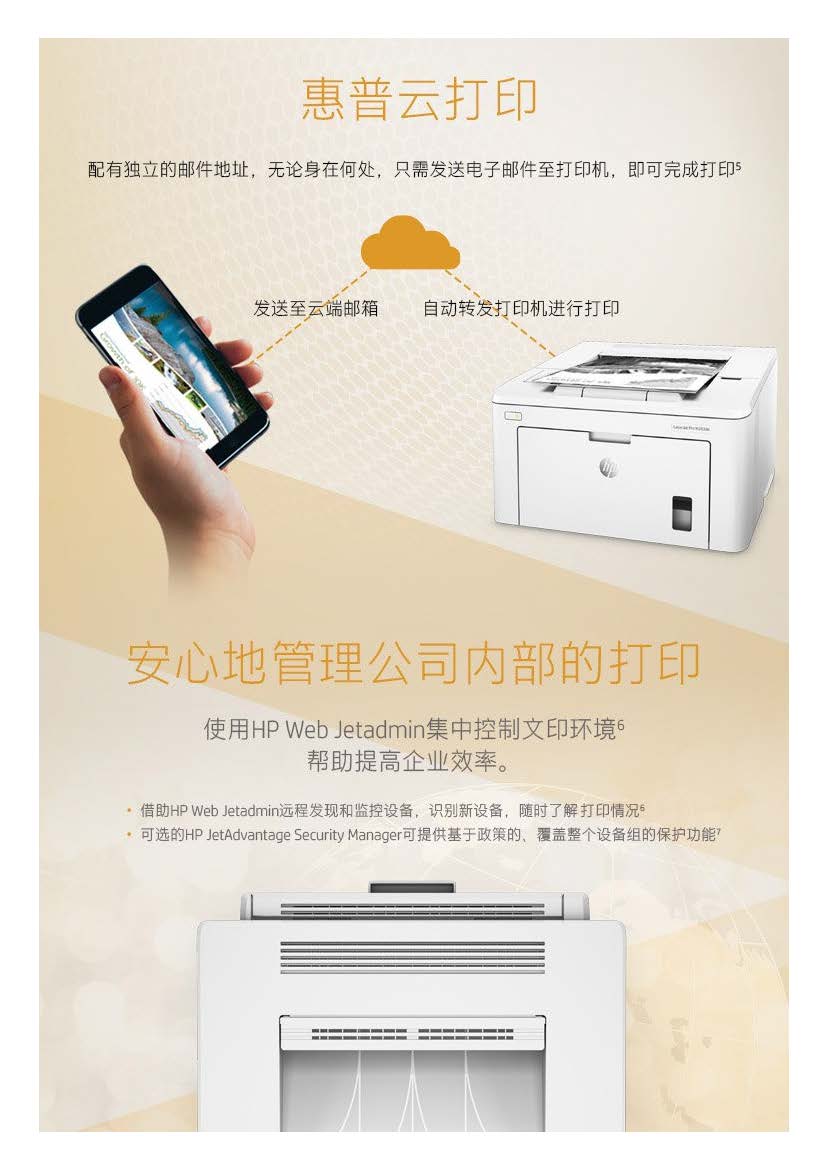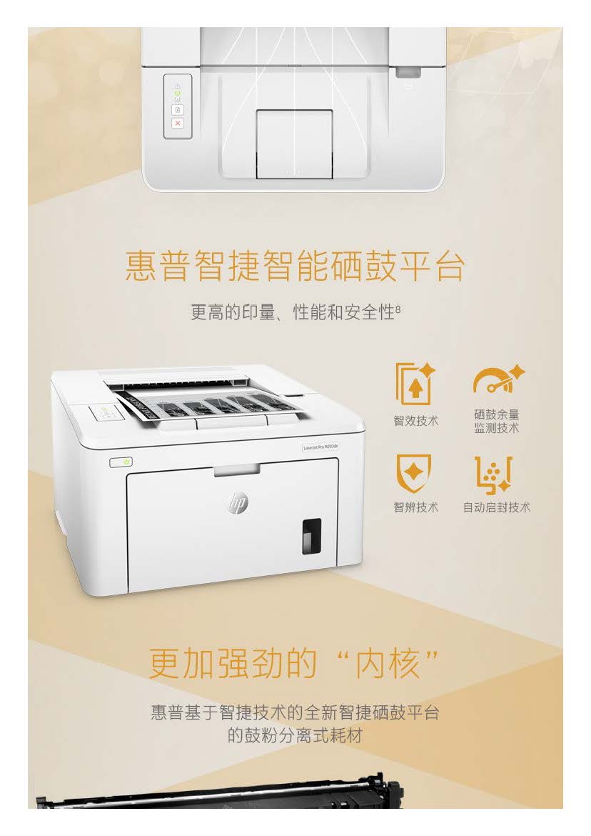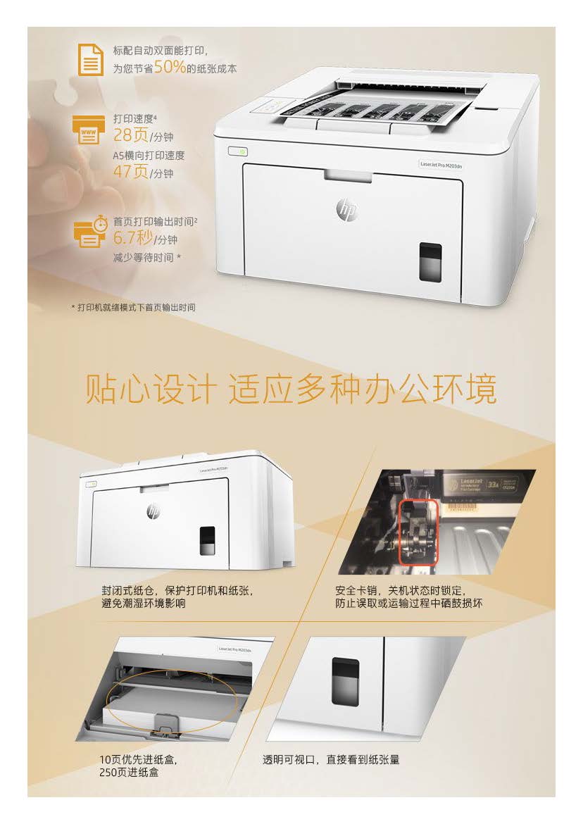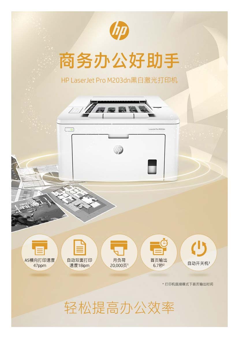 商品属性 [品牌] 惠普 [型号] LaserJet Pro M203dn [支持纸张尺寸] 76x127~216x356毫米 [首次打印时间] 黑白(A4,就绪模式): 仅6.7秒; 黑白(A4,睡眠模式): 仅7.6秒 [打印分辨率] 黑白(最佳模式): 高达1200x1200dpi; 黑白(正常模式): 高达600x600dpi、HP FastRes 1200(1200dpi品质) [节能证书编号] CQC16701142443 [商品单位] 台 [黑白打印速度] 黑白(A4,正常模式)高达28页/分钟; 黑白(A5,横向打印)高达49页/分钟; 黑白(A5,纵向打印)高达5页/分钟; 黑白(A4,双面打印): 高达18面/分钟 [最大打印幅面] A4 [自动双面打印] 支持 [质保时间] 1年 [耗材类型] 鼓粉分离式硒鼓 [售后服务内容] 1年质保
