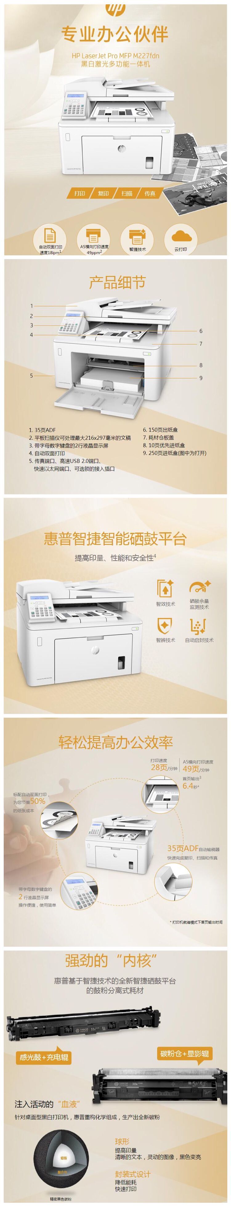 惠普Laser Pro MFP M227fdn Printer黑白激光打印机(A4打印/复印/扫描/传真 网络打印)