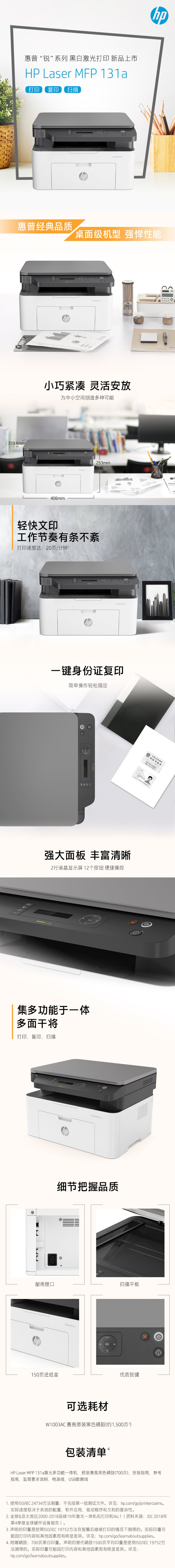 惠普Laser MFP 131a 黑白激光多功能一体机(A4打印/复印/扫描 USB打印) 一年送修