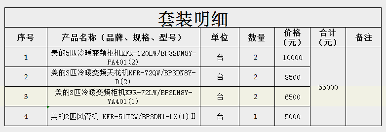 "美的空调套装(美的5匹冷暖变频柜机KFR-120LW/BP3SDN8Y-PA401(2)*2、 美的3匹冷暖变频天花机KFR-72QW/BP3DN8Y-D(2)*2、美的3匹冷暖变频柜机KFR-72LW/BP3DN8Y-YA401(1)*2 、美的2匹风管机KFR-51T2W/BP3DN1-LX(1)Ⅱ*1)"