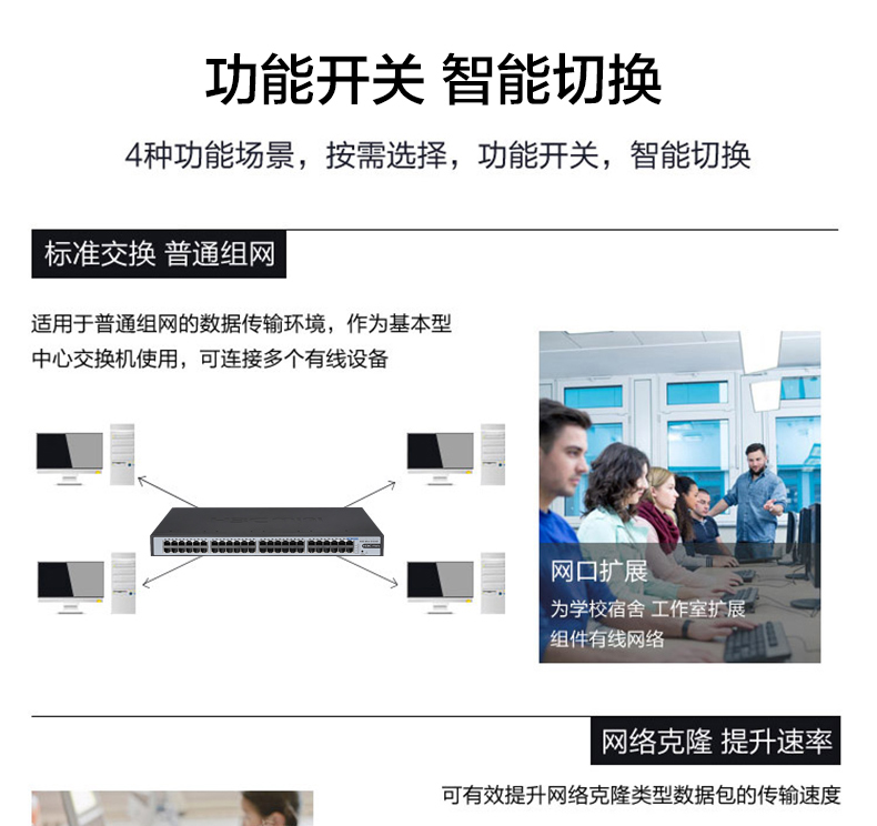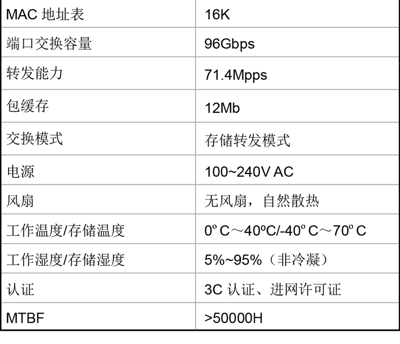 [参数] 交换方式 存储转发 交换机网络标准 IEEE 802.3,IEEE 802.3u,IEEE 802.3ab 网络管理 不支持