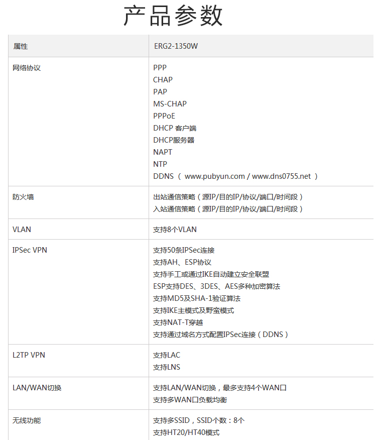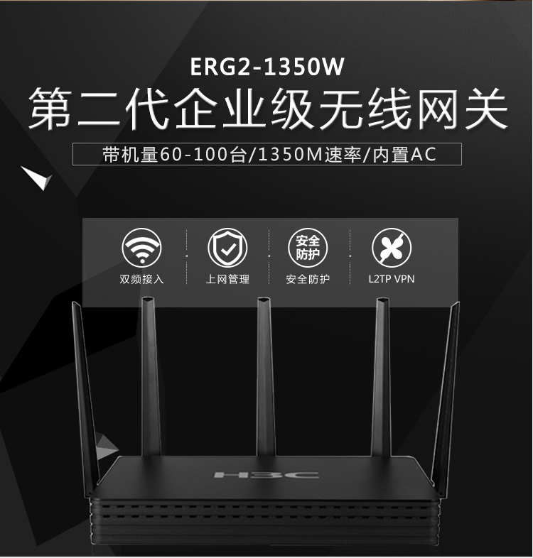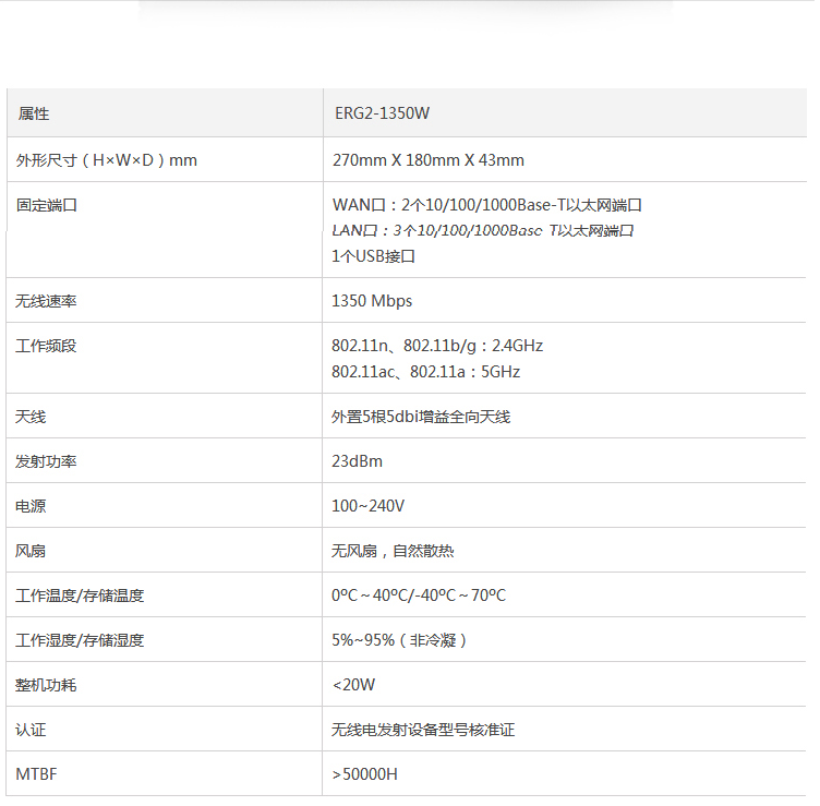 商品属性 [品牌] 华三 [参数] 机身材质分类 塑料机身 产品尺寸(mm) 270*180*43 [型号] ERG2-1350W [商品单位] 台