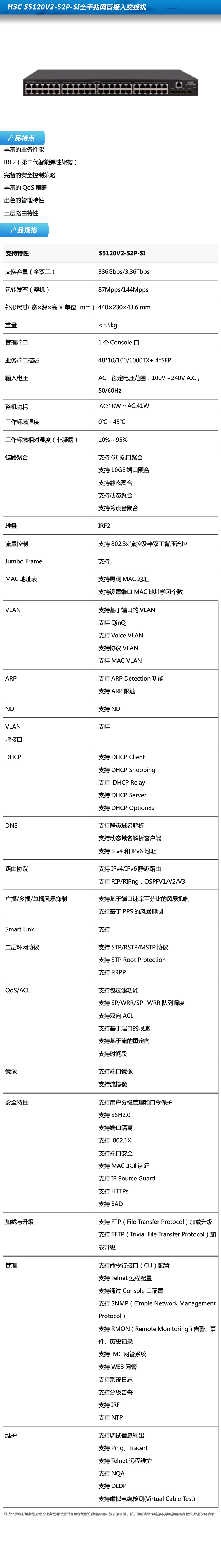 商品属性 [品牌] 华三 [参数] 速度 10/100/1000Mbps 网络标准 以太网 [型号] LS-5120V2-52P-SI [商品单位] 台