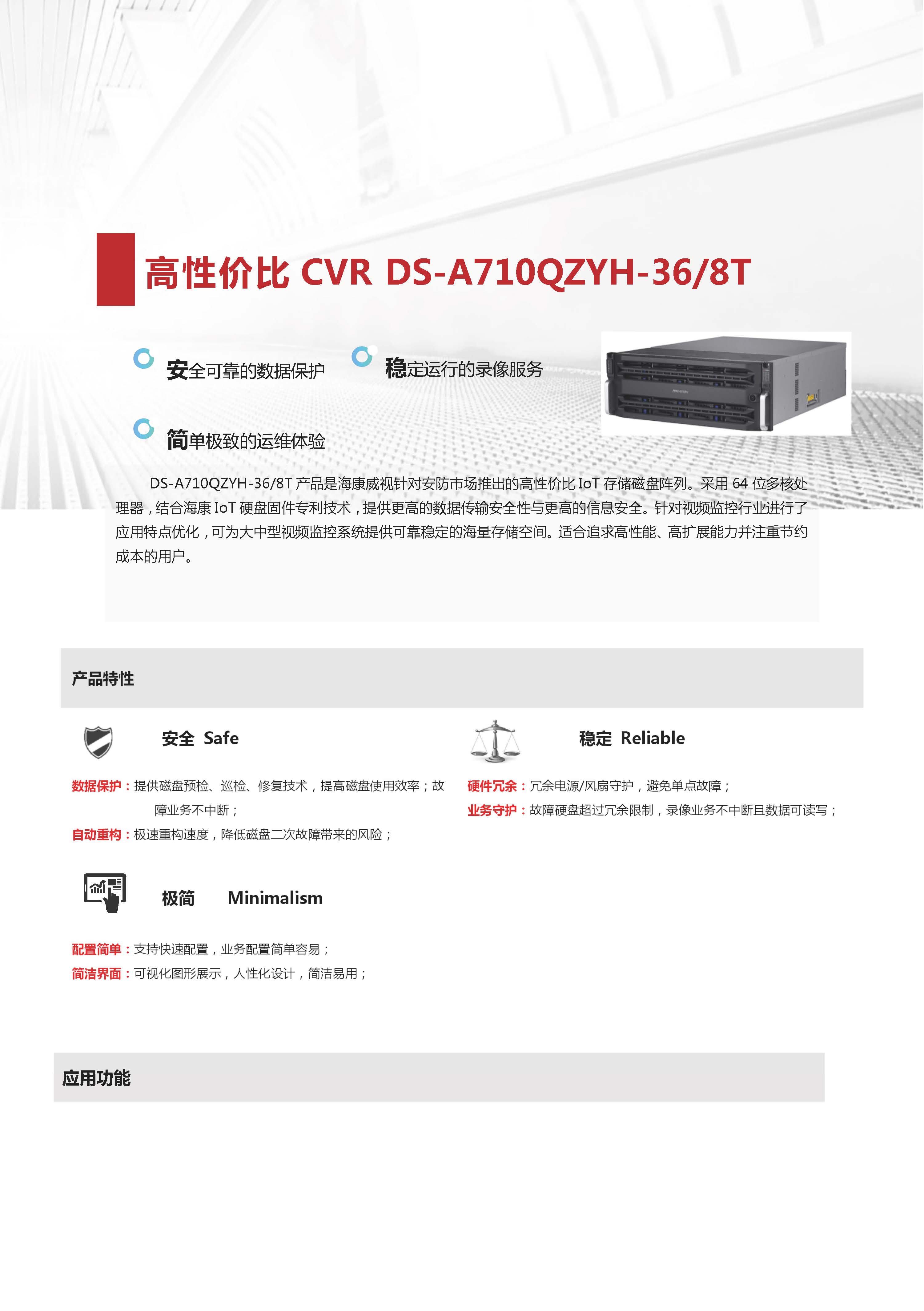 商品属性 [品牌] 海康威视 [型号] DS-A710QZYH-36/8T [商品单位] 台 [参数] 机架式/4U 36盘位/1536Mbps接入带宽/36块8T企业级SATA硬盘/64位多核处理器/4GB缓存(可扩展至64GB))/2个千兆数据网口/1个千兆管理网口/冗余电源/网络协议:RTSP/ONVIF/PSIA/(GB/T28181)
