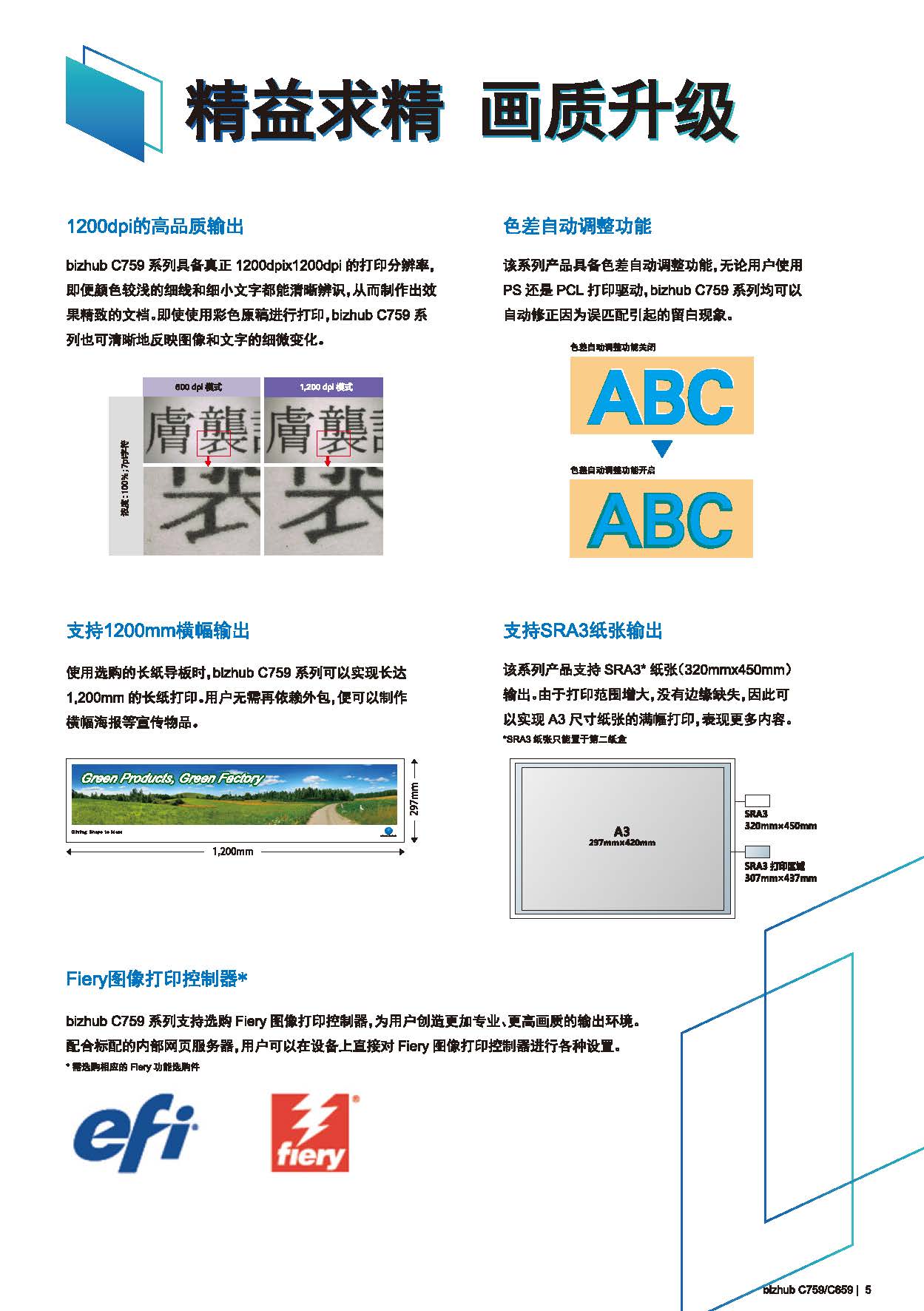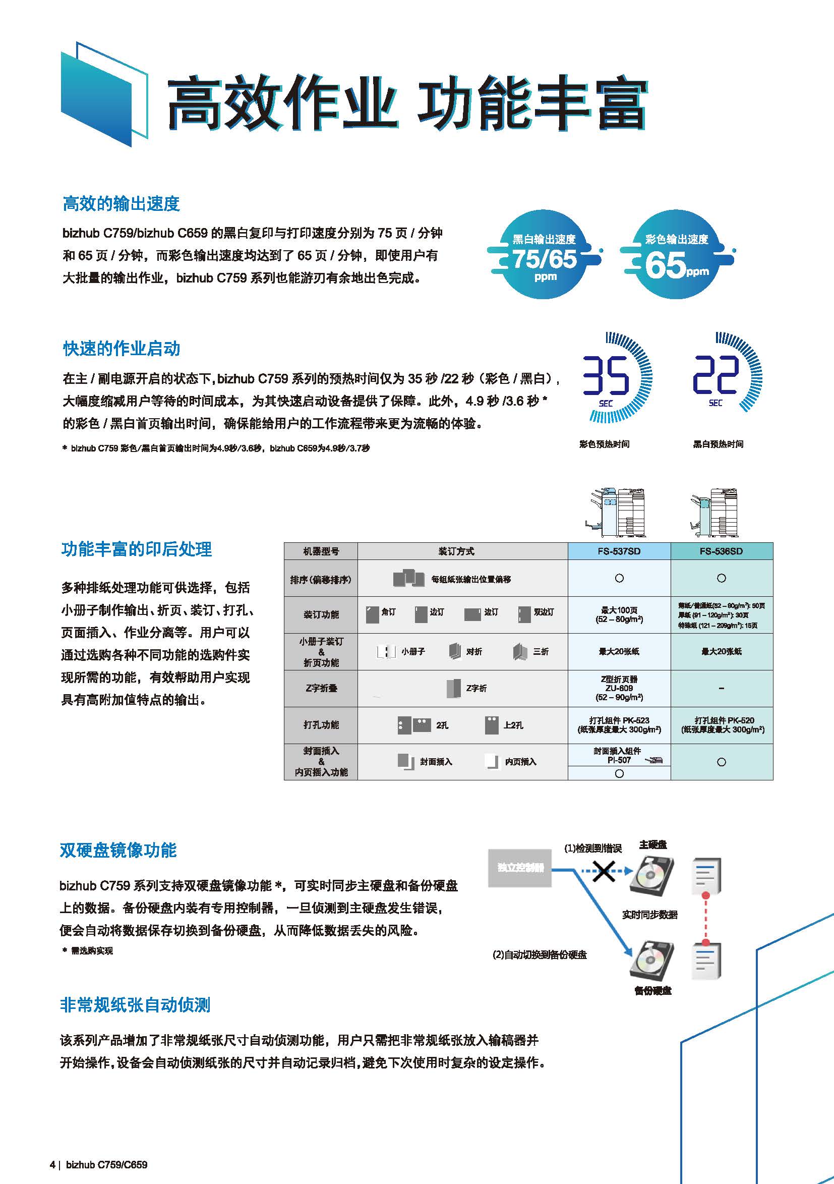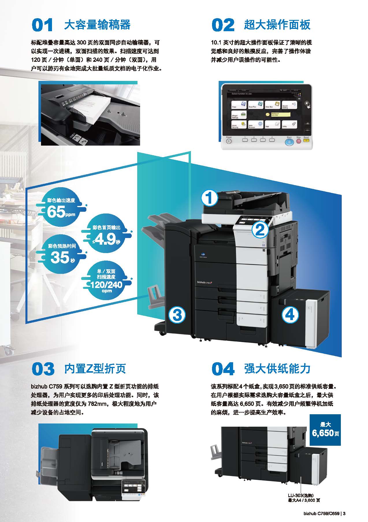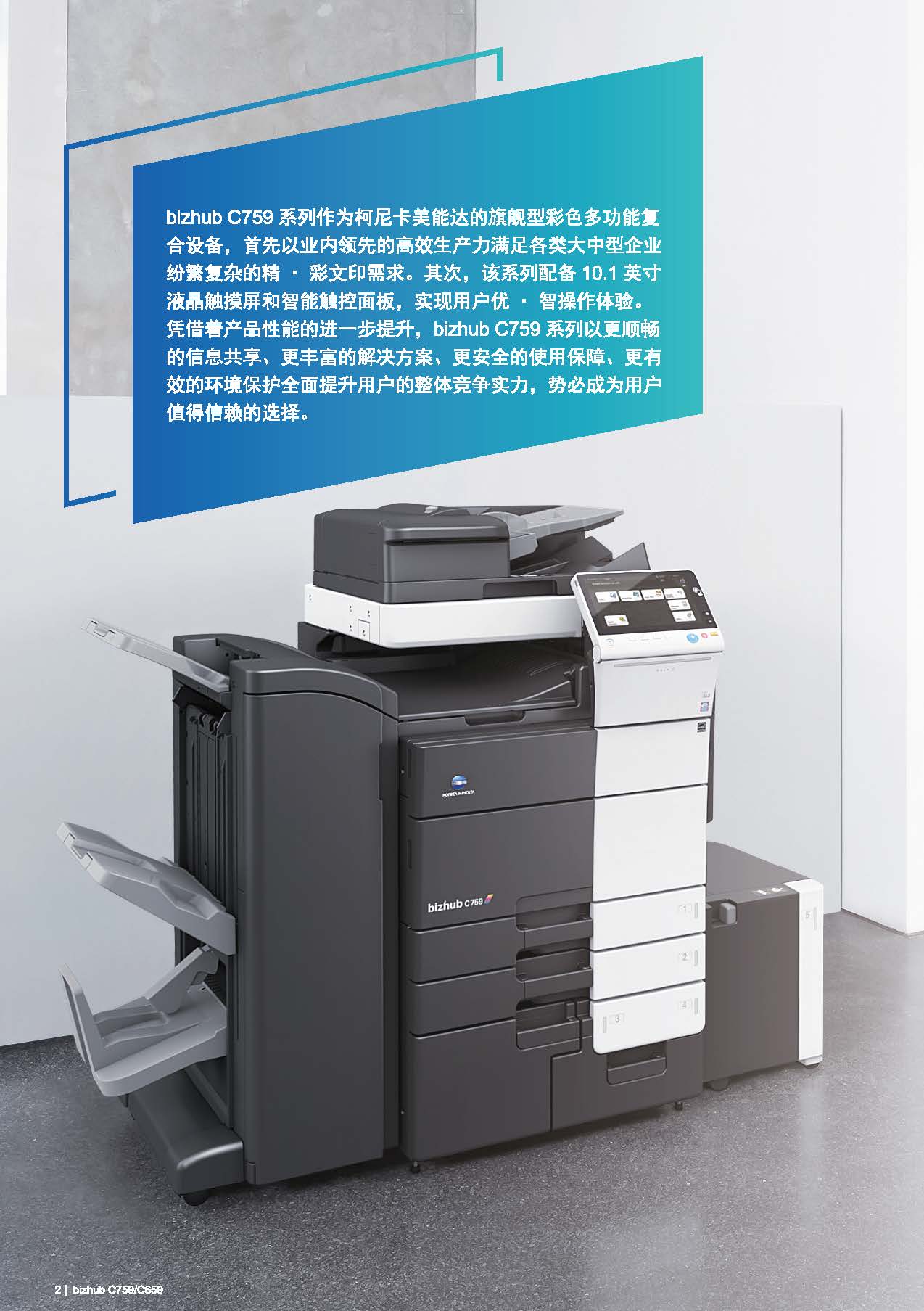 商品属性 [品牌] 柯尼卡美能达 [型号] bizhub C759 [复印速度 ] 彩65ppm、黑白75ppm [标配纸盒容量] 3650页 [复印分辨率] 1800dpi*600dpi [双面器] 有 [双面输稿器] 有 [网络打印卡] 有 [装订器] 无 [最大复印尺寸] A3+ [首页输出时间] 彩4.9秒或以下、黑白3.6秒或以下 [预热时间] 彩35秒以下、黑白22秒以下 [质保时间] 一年 [内存容量] 4GB [数据接口] Ethemet 10Base-T/100Base-TX/1000Base-T USB 2.0,IEEE 802.11b/g/n,Bluetooth; [随机附件] 彩色数码多功能机*1、电源线*1、电源线支架组件*1、墨盒组件(4支/套)*1、用户操作手册*1、驱动&用户手册(光盘)*1、Exit2 Tray*1、保修凭证; [售后服务内容] 厂商质保