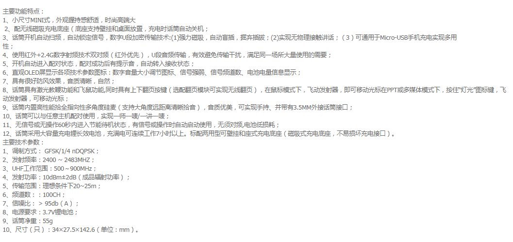 1、接收主机可与任意带话筒接口的有源音箱、功放搭配使用,实现无线话筒功能;