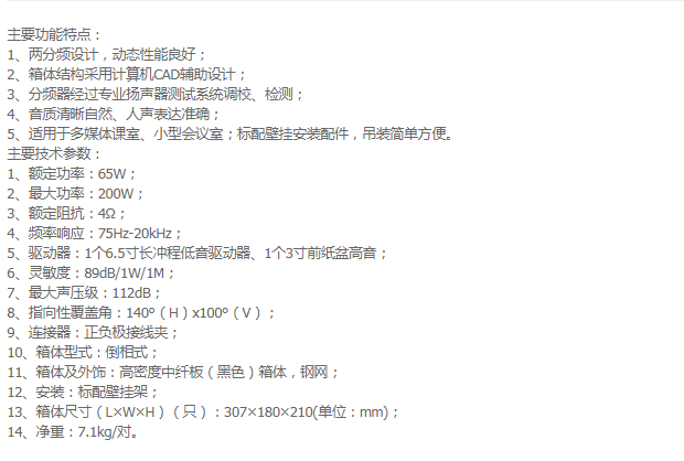 10、频响范围:50HZ ~ 15KHZ(±3db);