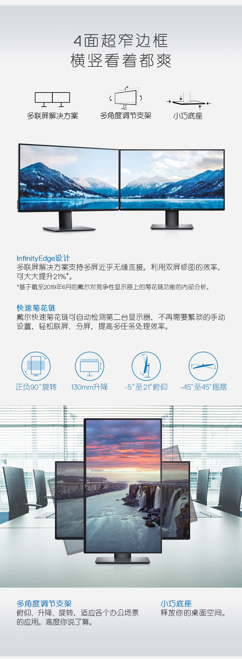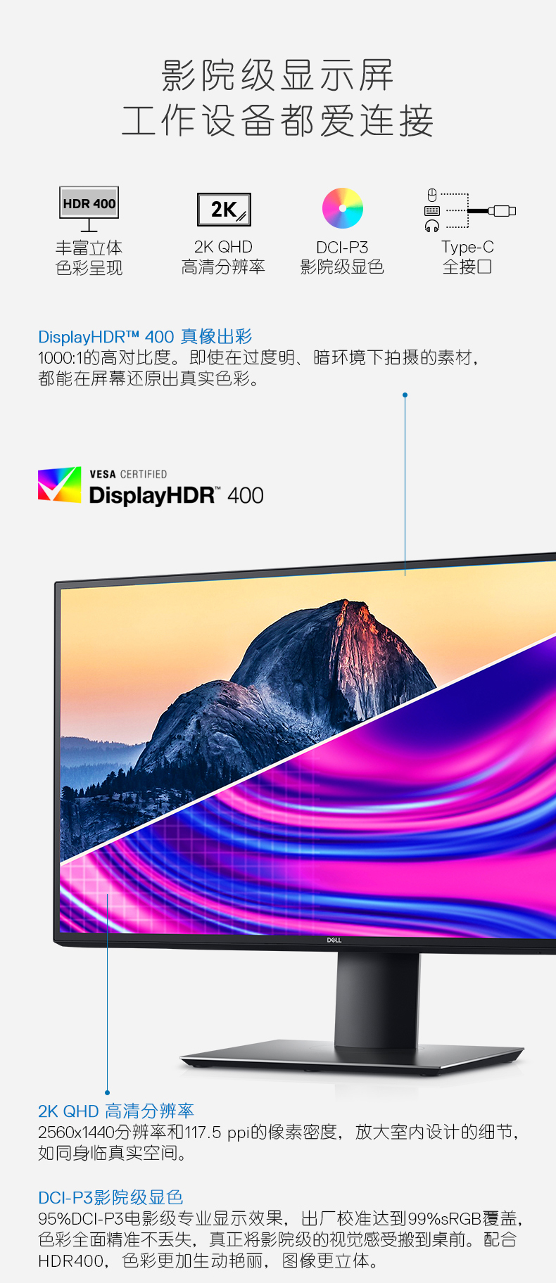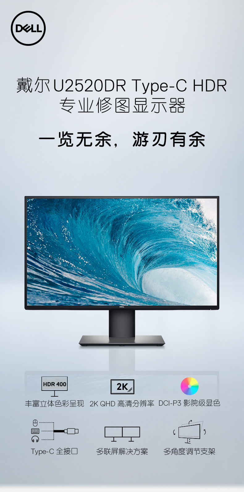 戴尔(DELL)25英寸 2K IPS Type-C 90W反向充电 HDR400 旋转升降 四边微边框 电脑显示器 U2520DR