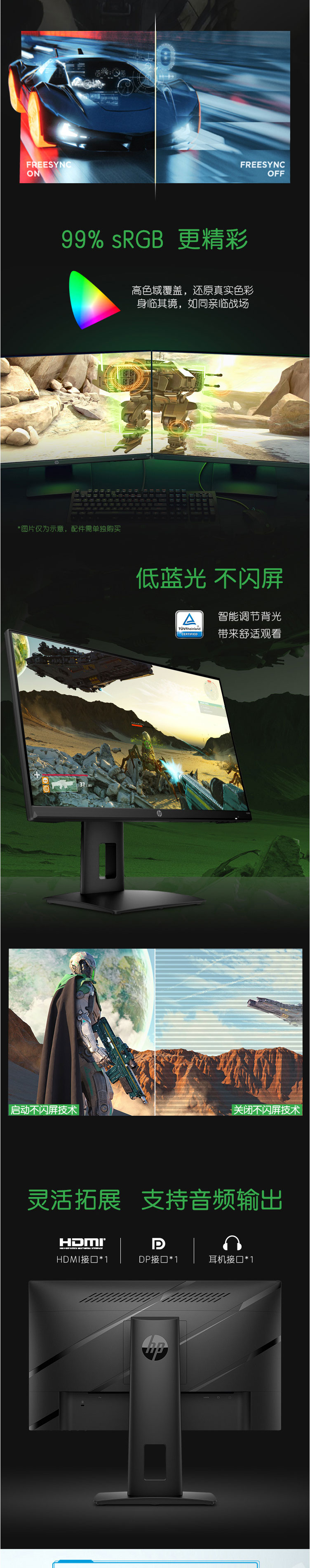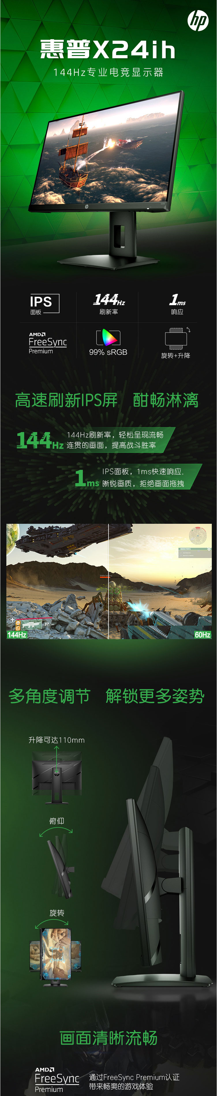 惠普(HP)X24ih 23.8英寸 IPS 屏 144Hz 微边框 FreeSync Premium升降底座
