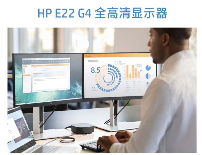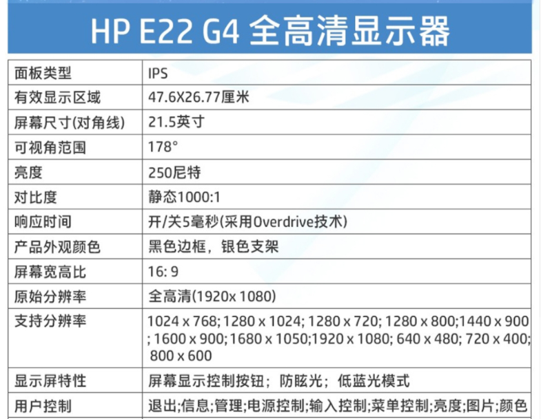 惠普(HP)E22 G4 21.5英寸 16:9宽屏商用显示器 三边窄边框设计 IPS面板 VGA HDMI DP接口