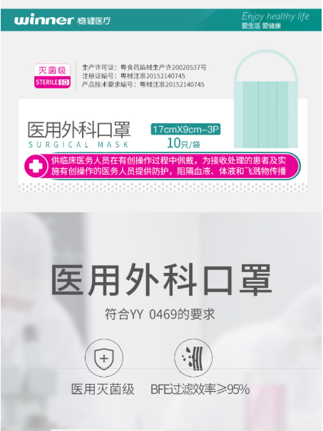 稳健 灭菌级 医用外科口罩1片 10只/袋 起订量1000片 单位:片