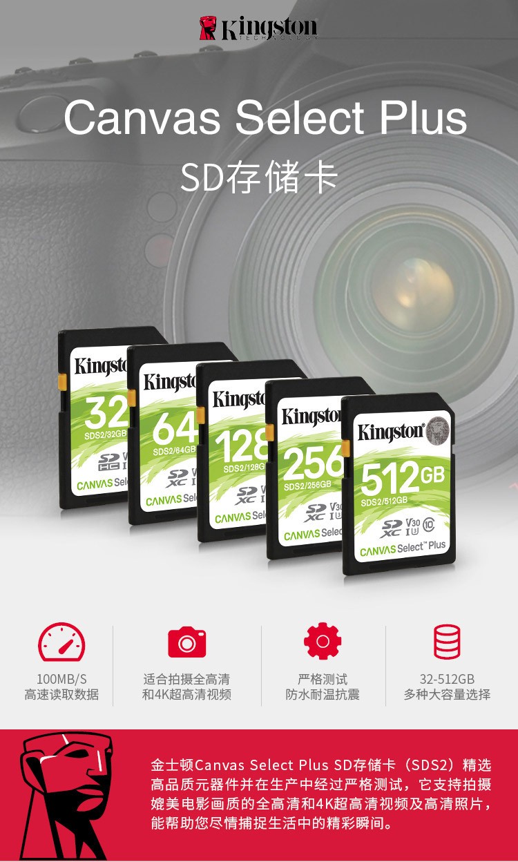 金士顿(Kingston)SD大卡佳能相机内存单反微单相机存储卡 class10 100M/S SDS2 32G