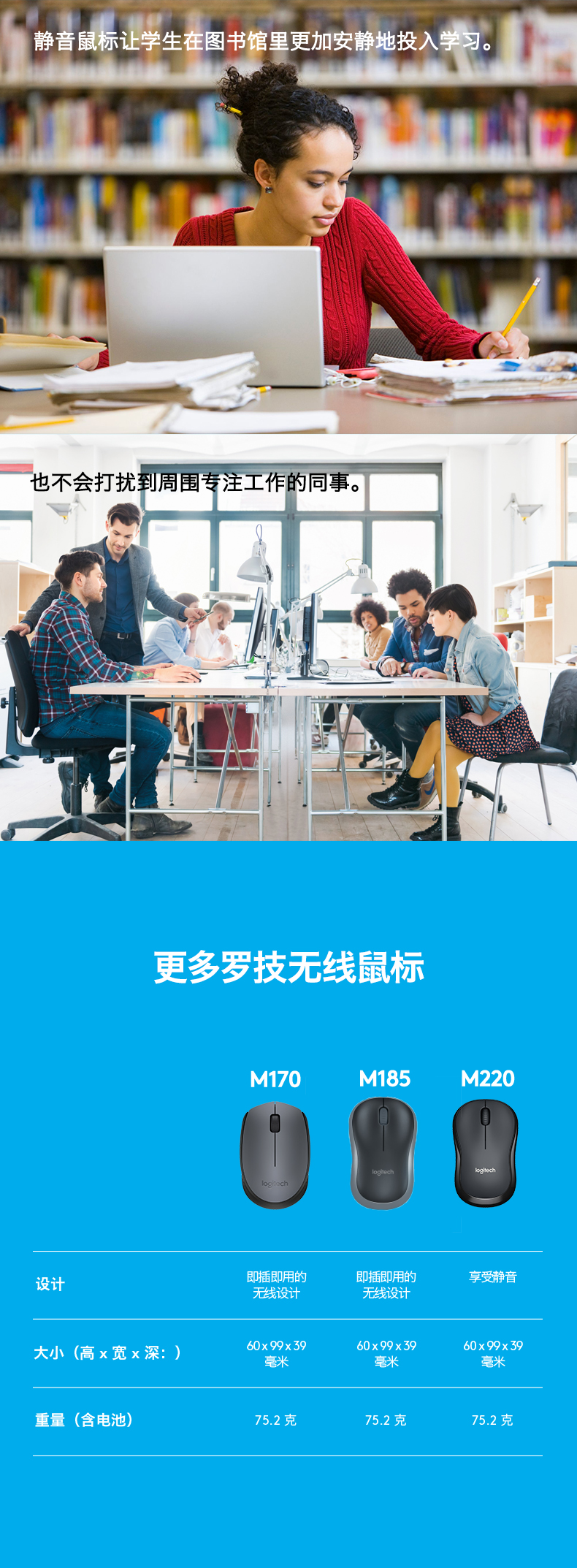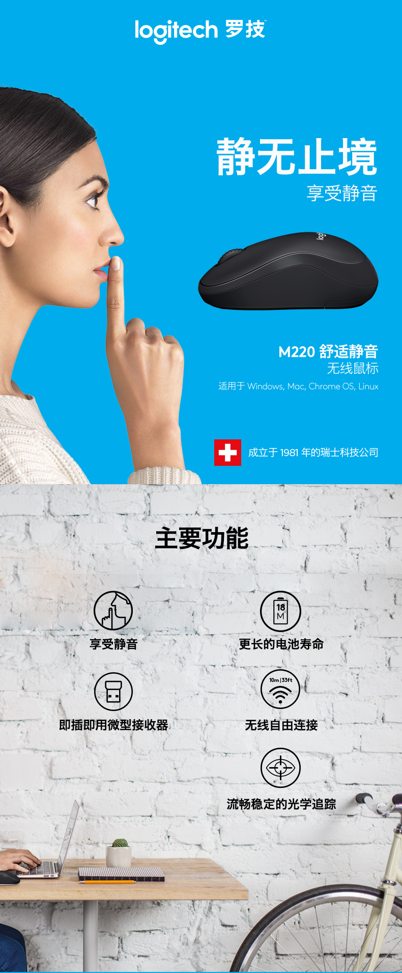 罗技(Logitech)M220 静音鼠标 无线鼠标 办公鼠标 对称鼠标 带无线微型接收器 灰黑色