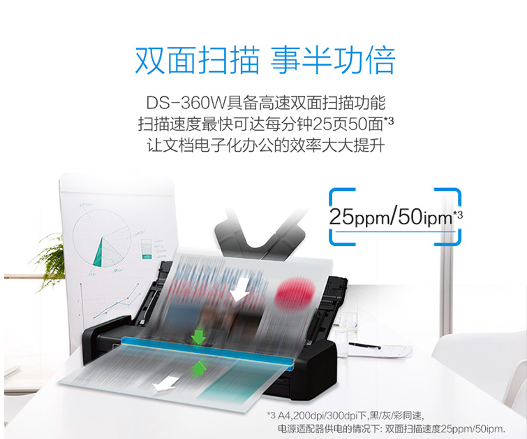 爱普生(EPSON)DS-360W 紧凑型A4馈纸式扫描仪 支持Wifi 电池供电 高速双面 25ppm/50ipm 自动进纸