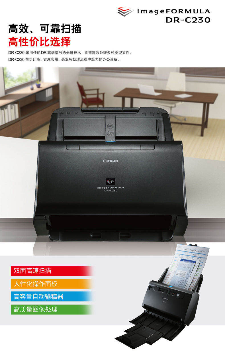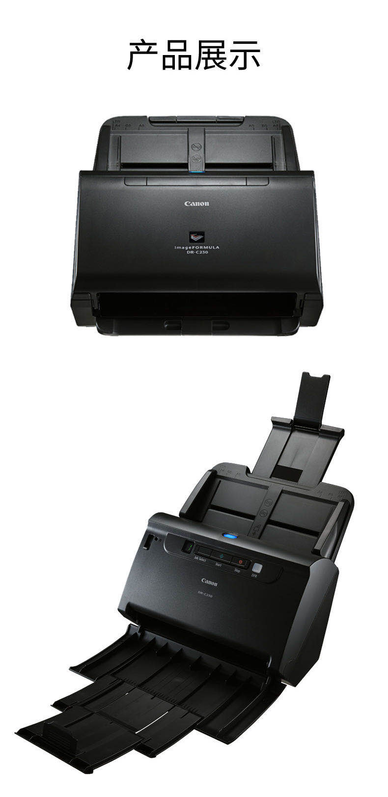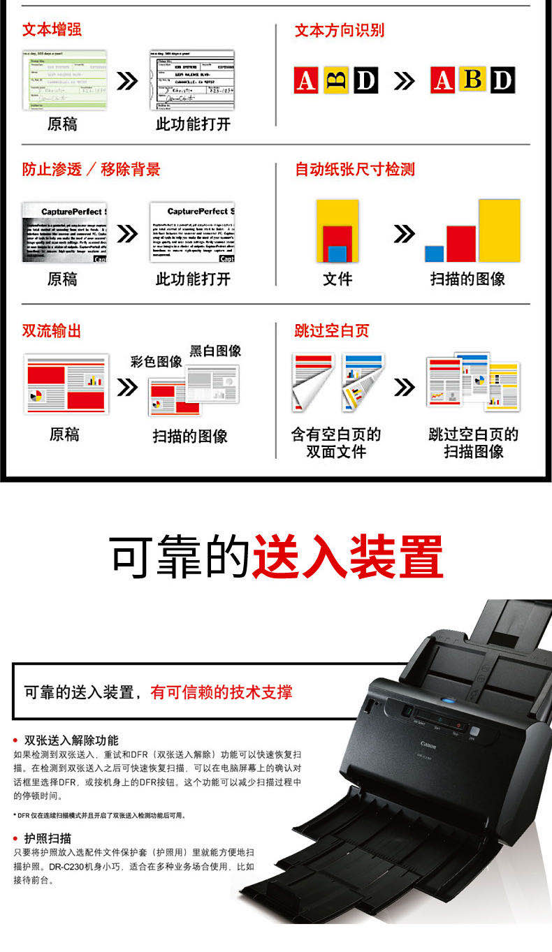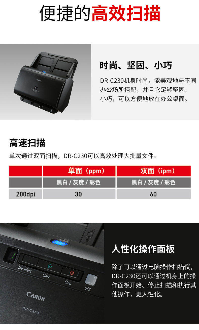 商品属性 [品牌] 佳能 [型号] DR-C230 [参数] 光学分辨率:600dpi 输出分辨率:100/150/200/300/400/600dpi [幅面] A4 [类型] 馈纸式 [双面扫描] 是 [多介质扫描] 是 [扫描速度] A4,200dpi,黑白/灰度/彩色:30ppm(单面),60ipm(双面) [扫描元件] CMOS [ADF容量] 60页80g/ m2 [质保时间] 1年 [随机配件] 标配 [售后服务内容] 1年质保